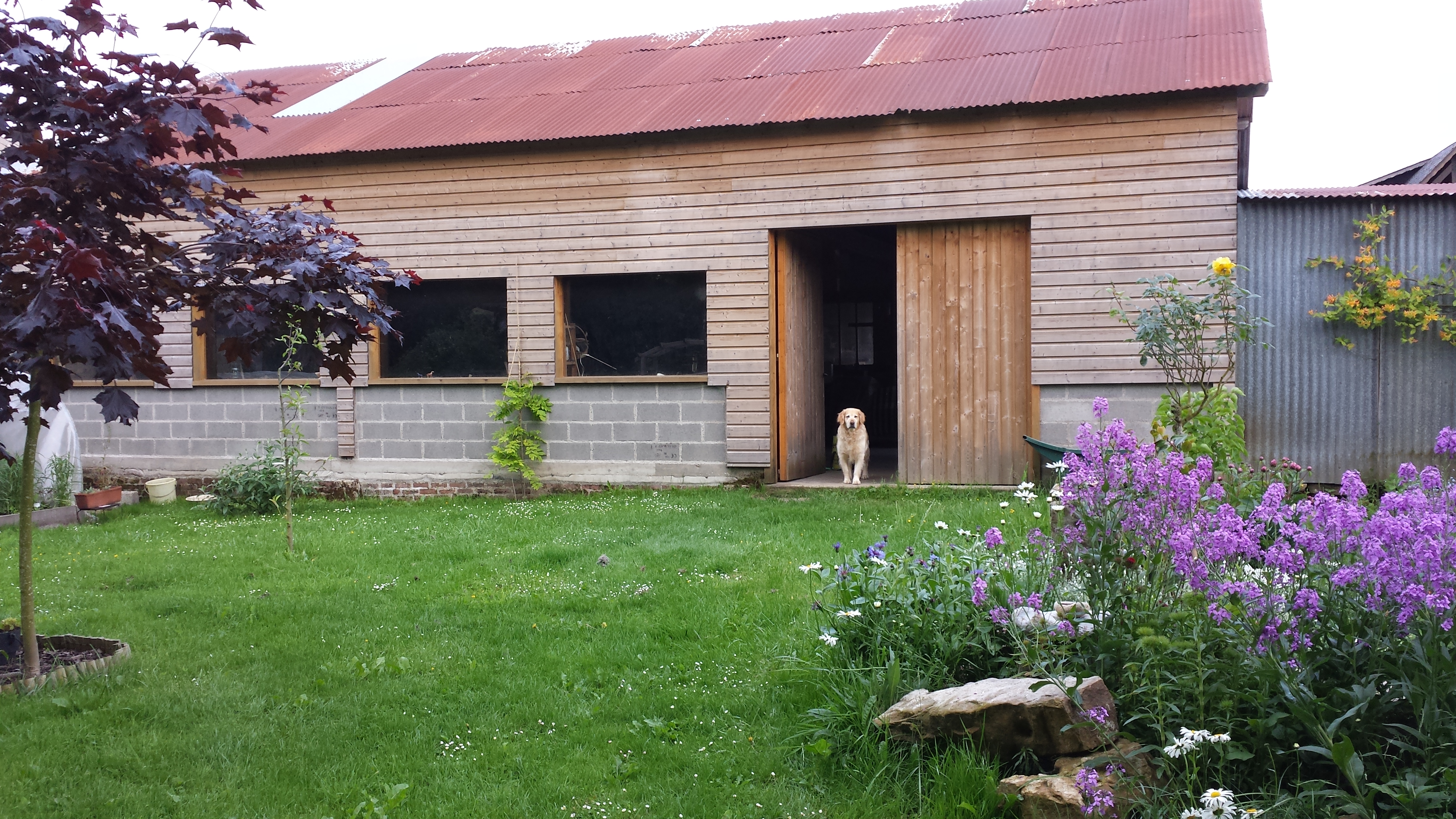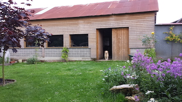 Here is Marcel about to pass through the hanger into our meadow ("pre" with an accent in French).