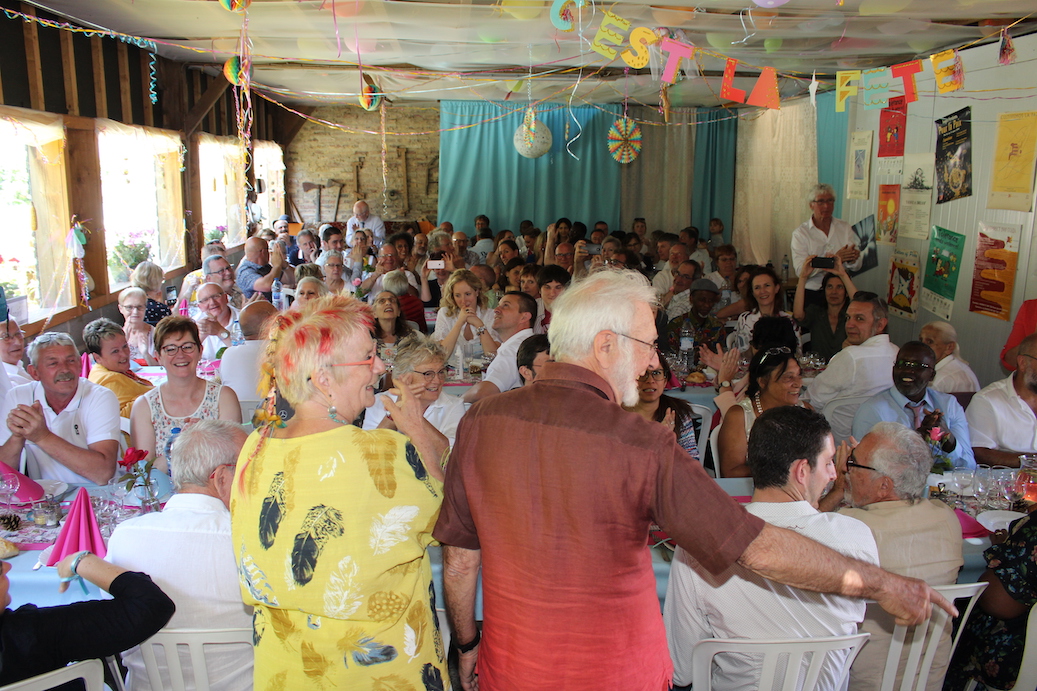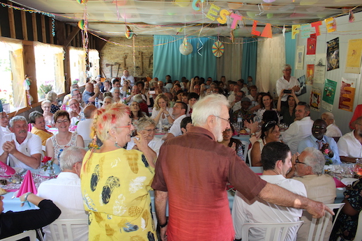 I've marked Sylvain, Mary France and Armand on the photo to show the family into which we have been adopted, not only as tenants but as members of the family. The hangar was the workshop of Sylvain's father who was the second of three generations of Norman carpenters. Sylvain is the third. With lots of help from Sylvain and Mary France we had decorated the hangar with drapes, balloons, etc.