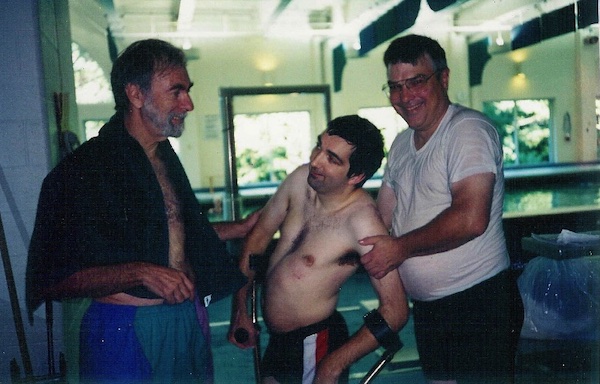 In the photo above I am with Georgie and Roy Aduskevitz, who took care of him. We are at the Gaylord swimming pool, where we went weekly for his therapeutic time in the pool. Roy, also, was like a father to him. I took advantage of our pool sessions to develop my underwater swimming capacity. I had inherited this from my father who was an excellent swimmer, and maintained my lung capacity as a distance runner. I could swim underwater the length of the 75 foot pool, turn underwater and return 15-20 feet.