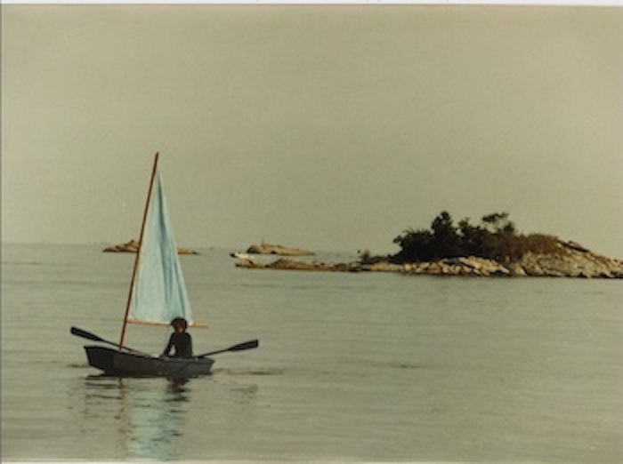 In the early years, we had a series of 12-15 foot sailboats with which sailed along the coast of Long Island Sound, our favorite destination being the Thimble Islands of Guilford. Eventually we were reduced to the tiny sailboat shown here, as the first big sailboat was destroyed when it was not sufficiently moored to ride out a night storm, and the second big sailboat had a leak that we were never able to repair.