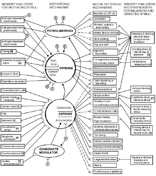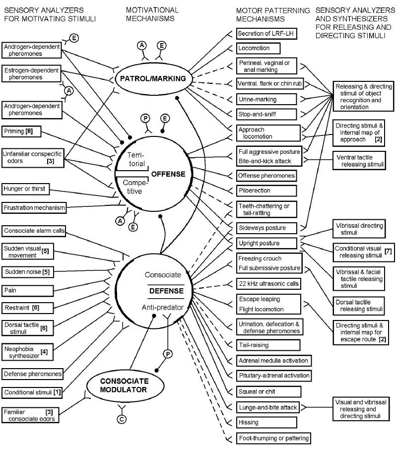When I returned from the Soviet Union, I decided to concentrate on a research program to understand the brain mechanisms of aggression. Believing that the basic approach should be firmly rooted in an evolutionary approach, as a first step, I went to the library to learn everything possible about the aggression of rodents, especially the observations of aggressive behavior in wild animal species. I found and studied hundreds of articles, primarily by biologists, and put together an evolutionary analysis of the aggressive behavior of muroid rodents, which was published in 1980 in the journal Aggressive Behavior and is available online. To explain the data, I used a motivational systems analysis. The motivational systems analysis had been refined in our laboratory by one of my students, Michael Lehman, based on an approach that I had used to explain the data from our laboratory rats as published in a 1975 paper in Behaviour. Michael noted each act of two interacting animals on a moving tape and then fed the data into a computer to determine which sequences were non-random. We then assumed that the non-random sequences represented behaviors controlled by one particular motivational mechanism. The study with Lehman, published in Behaviour in 1977, identified motivational mechanisms for exploration/marking, offense, defense and submission, and indicated several sensory inputs and motor patterning outputs for each of them. This motivational systems analysis provided a basic model that I have been elaborating ever since. The only fundamental changes in the 2006 model shown below is the renaming of exploration/marking as patrol/marking, the inclusion of submission as a special case of defense (consociate defense), and the omission of a motivational mechanism for self-grooming for which we could not obtain supporting data.
