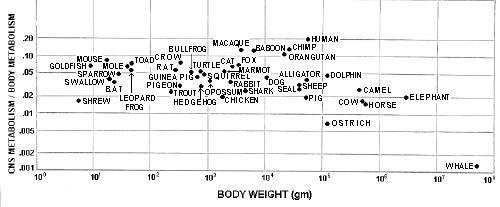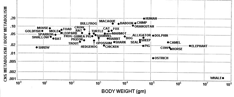 One of the perennial puzzles in brain research has always been the apparently complex relationship between brain size and body size. In particular, there is a great increase in the ratio of brain to body size in warm-blooded animals. I had long been intrigued by the similarity of two complex functions: brain weight as a function of body weight; and basal metabolism as a function of body weight. In discussing this with two of my best undergraduate students at the end of the 1970's, Jon Mink and Rob Blumenschine, we speculated that the relationship might be quite simple if one assumed that brain metabolism was a constant proportion of overall metabolism. Intrigued with this possibility, I set them the task of amassing the relevant data from the literature, and their results were quite remarkable. We found that most animals use 2-8% of their metabolism for the central nervous system (brain, spinal cord and nerves). In searching through all of the literature on this subject, we found an obscure publication by G.W. Crile in 1941 that came to a rather similar conclusion, but without the needed documentation. We had, indeed, discovered a new scientific law Our documentation was a laborious task. Brain and body weights were often available, but to obtain spinal cord weights as well was not common, and sometimes we ended up having to make our own observations on preserved specimens. Metabolism data for the brain and spinal cord were even more difficult to find in the literature, and considerable analysis was needed to obtain the needed information.