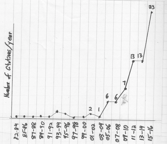 Publishing the results turned out to be a problem. In February 1979 we sent it to Science Magazine, which has a very wide readership , but it was rejected for publication. There was only one reviewer who said that "the paper contains no original data" and "the results of the analysis do not lead to any conclusions about why there is such a relationship." We then sent it to the American Journal of Physiology where it was published in 1981, but it was lost there because very few people referred to it for the next 25 years. Instead, Science Magazine published in 1983 a much inferior paper, based in part on our study, which is often cited instead of us. It would seem that the reviewer stole our ideas and published them himself (something that happens all too often in science!). As of 2006, according to the Science Citation Index, our paper had been cited 35 times while the paper by the other author in Science had been cited 95 times. However this changed after 2006, as shown by the following graph. It goes to show that you need patience for the truth to come out. It reminds me of the graph for the recognition of human rights which took many years after the Universal Declaration of Human Rights was adopted by the UN.