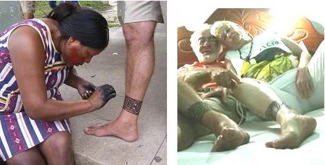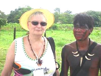 Kiki and I were attracted by the plans for the World Social Forum of 2009 in Belem, in the Brazilian amazon, which bussed indigenous peoples in from throughout the region, many traveling for weeks, in order to save the forest from destruction. As they eloquently put it in their dances, music, sales items and conversations (their Portuguese not much better than mine), their battle to save the forest was not only to preserve their own cultures, but also to preserve the planet which is endangered by global warming. They came in their war paint and bearing their blowguns and bows and arrows to make the point. There were Kayapo women on the streets of the Forum who painted the Europeans and urban Latinos with the tattoos of their culture. Kiki and I got tattooed, as shown in the photos and later, after the initial painted images had worn off, we replaced them with permanent tattoos in Paris.