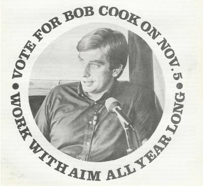 Both Bob Cook and Freddy Harris were very appealing candidates, speaking eloquently for social justice and against the war in Vietnam. In the election, Cook obtained several percent of the vote, one of the highest votes in the country for an anti-war candidacy. And afterwards, those of us who had worked on the campaigns decided to keep working as an independent political party that we called (to be as neutral as possible) the "American Independent Movement." The name was so neutral that the same name was used later by the racist governor of Alabama, George Wallace, for the political party that he founded.