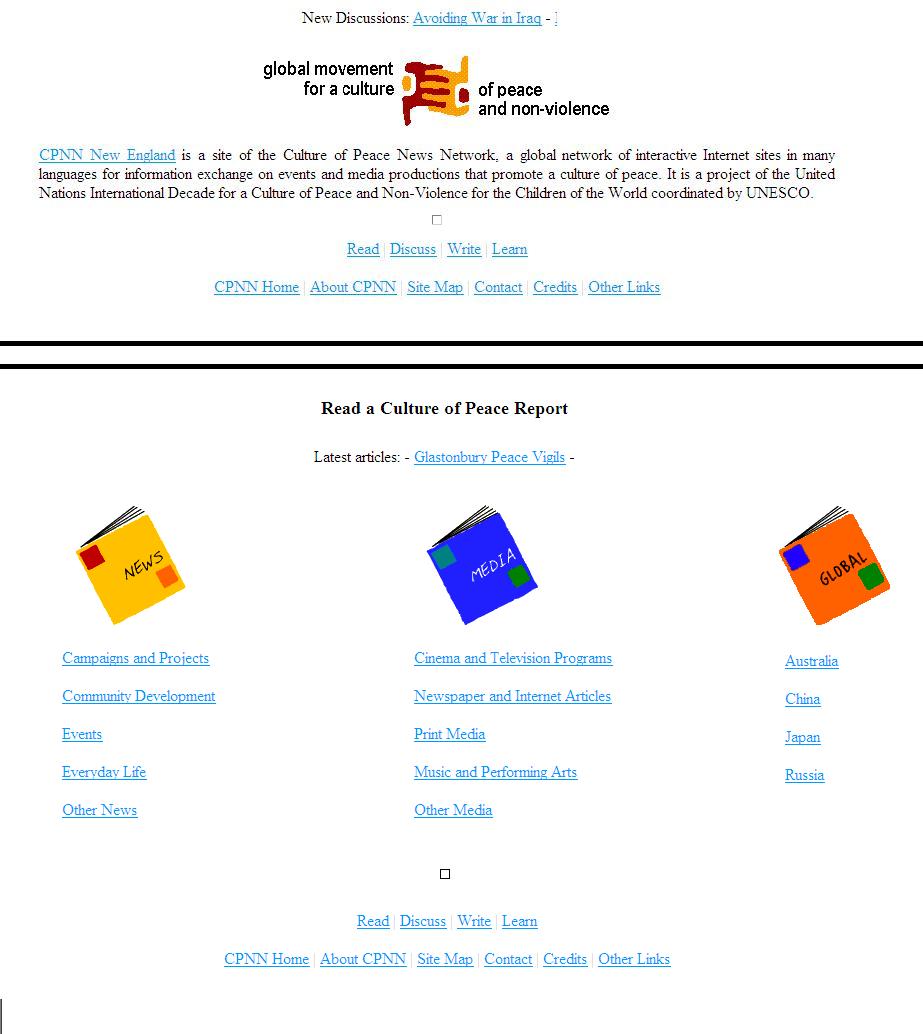 When I returned with Lindsay to the United States after my retirement from UNESCO in June 2001, I put my energies and hopes into the Culture of Peace News Network (CPNN) which I had begun at UNESCO (see CPNN-1.. Seeing how the Cable News Network (CNN) was very successful at carrying the news of the culture of war, I thought I could do the equivalent with CPNN for the culture of peace. I said that CNN was an abbreviation of CWNN, the "culture of war news network" and joked that just as newspapers maintained a full set of obituaries prepared for the deaths of famous people, so, too, CWNN, somewhere in Atlanta, kept updating a full set of future wars, so that as soon as one broke out they could immediately broadcase its full pre-history. I conceived of CPNN as a virtual community of people who would write articles for CPNN and who would edit awkwardly or badly-written articles by others to put them on line. It was based on the system that my team had developed at UNESCO with contracts to Di Bretherton of Australia for the technical details based on Perl scripting and the training procedures developed by Di and Zeynep Varoglu working with me at UNESCO. I conceived that CPNN would grow as separate websites in different languages and for different regions based on the same principles and translating and exchanging articles among themselves. I started small as CPNN New England.