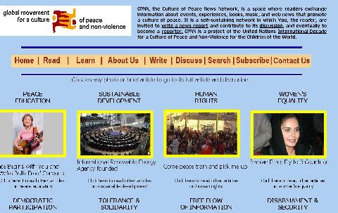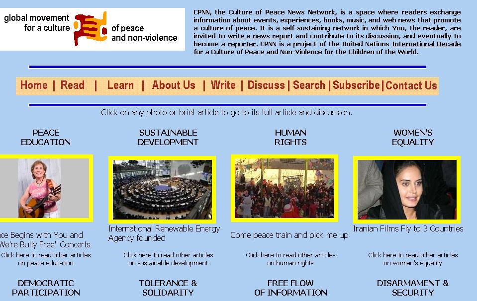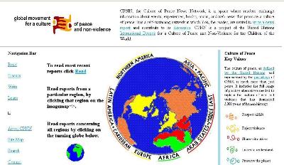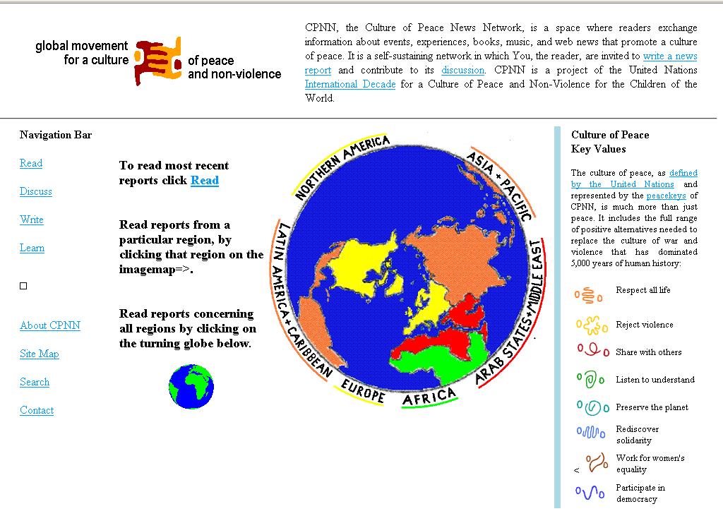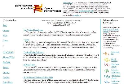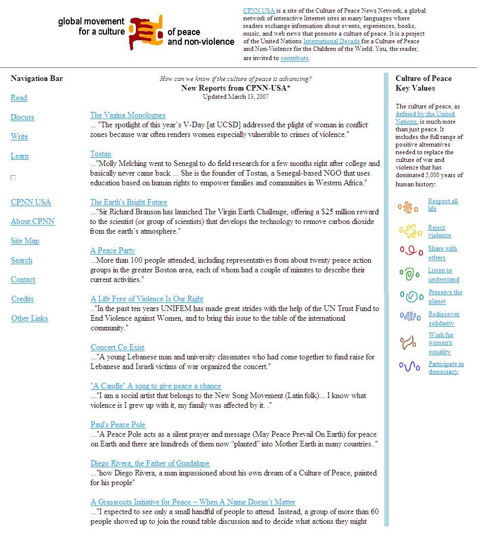 For a number of years I had the collaboration of Joanne Tawfilis who ran the Art Miles project and who solicited articles and involved students in Southern California. At one point she promised to involve the national network of United Nations Associations in the effort, but that did not materialize. By 2007 it was clear that CPNN-USA was not growing and that it was not being joined by other CPNN sites around the world, so I decided to use the mailing list established from the 2005 World Report on the Culture of Peace and transform CPNN from CPNN-USA to CPNN-WORLD. I started with a new and much sexier home page as shown below.