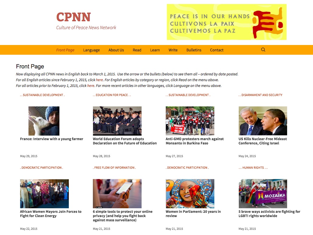 I continued to work on CPNN as my highest priority, but it continued to frustrate me. During these years I had to add to my usual email closing: "Peace through struggle, and patience." I continued to think of myself as a prophet, prophesizing the collapse of the American empire and a window of opportunity for the culture of peace, and I continued to use CPNN as a harbinger and as a system of information exchange for establishment of a culture of peace, but I failed to see much progress, either with CPNN or with the global movement it serves. As for the global movement, I wrote a new book, Embrace the Fire: Plant the seeds for a Culture of Peace based on the articles published in CPNN. I published it at Createspace and put it on line, but got no sales and no feedback. In 2012 I started publishing a monthly blog on the internet, Transition to a Culture of Peace; World history as it is happening, but again with little feedback. As for CPNN, as I mentioned in an earlier page The Culture of Peace News Network continued, I undertook new formats to make it more attractive, but without much success. Here is a time frame for the various revisions and innovations since the beginning in 1998: 1997 - Initiation of Info-net at UNESCO with contracts for all UNESCO languages (See early history) Here is a view of the homepage of the new Wordpress version in 2015 (Click on image to enlarge)