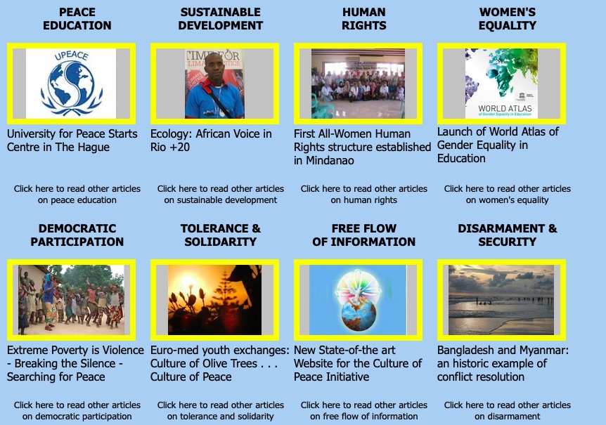 We had sent out monthly information bulletins for the decade reports to our mailing list beginning in October 2005. Beginning in 2012, these bulletins became a summary of the many articles being published on CPNN. A new format was established with a text followed by images linked to articles published during the month concerning the eight program areas of the culture of peace as shown here :