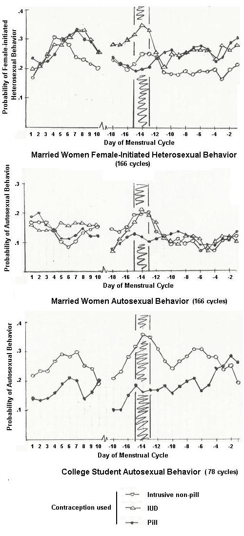 Along with my colleague Alice Gold at Wesleyan during the 1970's we applied for an obtained a government grant to study the sexual behavior of married women as a function of the birth control method they were using. The results of our study, conducted with the help of very capable assistant, Anne D. Burt, showed what had always been assumed, but never before proved, that human females, like all other mammals have a period of increased sexual interest at the time of ovulation. We were able to succeed, where others have failed, by paying the subjects for very careful data collection (daily questionnaires for many months), and by several new measures based on interviews that Anne conducted with the participants beforehand. Instead of simply measuring intercourse and other heterosexual rates, we distinguished the initiator of the sexual activity, and we also asked participants to record autosexual activity, i.e. activity without a partner. It turned out that estrus was masked by other effects for heterosexual behavior in the case of pill contraception (which blocks the hormonal basis of estrus) and types of contraception such as condoms, diaphragm which interfere with the spontaneity of the interaction. Only autosexual behavior and behavior of subjects with non-intrusive contraception (the IUD) showed the estrus effect. As always seems to be the case when one makes an important scientific discovery, it was difficult to publish our results. First they were rejected by Science Magazine when the reviewer said that "in this controversial field, the data and conclusions have to be cast iron." I remarked that this sounded like the old fashioned "chastity belt" that women were forced to wear. We appealed the rejection through Neal Miller but without success. Then we published in the very prestigious New England Journal of Medicine. This got us publicity in many newspapers around the world, but also the wrath of the editor of the journal when he discovered that we had already published some of the data in a journal for doctors' offices. We were forced to publish a formal apology!