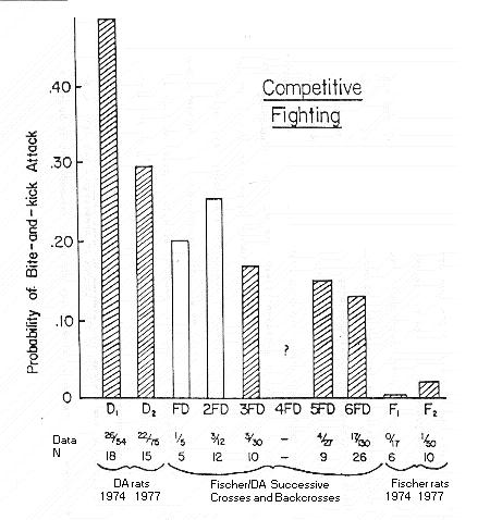 Like scientists in basic physiology, but unlike most scientists doing behavioral research, I used only highly-inbred strains of rats in my experiments. This gave me more control over the variables influencing behavior, as I would usually include more than one strain or hybrid in my experiments differentiate the results as a function of strain. Hence, in establishing my laboratory at Wesleyan, I did an initial survey of five different highly-inbred strains across various measures of aggressive and related social behaviors to see their differences. I sent the results to the journal Behaviour, but it was rejected and never published. However, the results are available on-line in my materials on the Aggression Systems. I followed up on the genetic differences by undertaking a long-term study of the genetic structure of competitive fighting using a simple selective breeding design in DA and Fischer rats. Competitive fighting is the offensive fighting (bite-and-kick attack) that occurs between rats when they are hungry and you put only one piece of food in the food hopper that they share. Since the behavior was present in the DA strain, I cross-bred it to produce hybrids with the Fischer strain which did not have competitive fighting. I then tested the hybrids for the behavior, and since the behavior was present I cross the hybrids with the Fischer strain" and keep iterating this procedure for many generations. In that way, if the behavior was determined by one or several tightly-linked genes, the behavior would be retained generation after generation. If the behavior was determined by multiple genes that were not linked during reproduction, the behavior would diminish and gradually disappear over many generations.