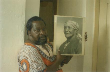 On one of my missions, I had the privilege of going with Malangatana and some UN colleagues out into the countryside to his ancestral land where he had grown up with his mother in a little house (both since gone). In the photo below, Malangatana holds a photo of his mother. He told of having known an anthropologist when he was a child who had come to the countryside to study the people's customs. We had gone to the countryside that day to help him materialize his dream of establishing an art school and art colony on that land, I have a wonderful photographic record of the day, including Malangatana in front of his family's ancestral tree. .