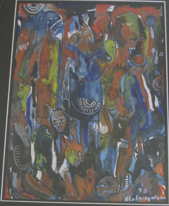 One of my most vivid recollections of Malangatana was when he came one year to the General Conference of UNESCO representing Mozambique and was asked to speak at a certain point before the assembled diplomats. Instead of speaking, he took the microphone and began to sing in a deep, almost operatic but untrained voice, a song for peace! I think never before has the bureaucratic procedures of the General Conference been so beaufully undone! Unfortunately, as described elsewhere, the Mozambique National Culture of Peace Programme was destroyed by the indifference of the powerful Member States, and I was not able to stay involved or to maintain contact with Malangatana and my other Mozambican friends. One thing I keep to this day, however, hanging on the wall next to me as I work, and that is a small painting that I bought from Malangatana when I visited his home during one of my missions to Maputo.