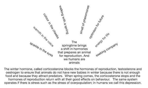 At the same time, my students and I found that human depression was characterized by hormone changes very similar to those taking place in rodents during their reproductive postponement: i.e. high levels of corticosterone and depressed levels of the sex hormones such as testosterone and estrogen. In fact, testosterone and estrogen are needed not only for overt sexual and aggressive behavior, but also for nonverbal communication that we take for granted in everyday life, such as color in the face, sparkle in the eyes, vigor in the voice, talkativeness, vigor of movement and posture, etc. A person without these qualities gives the impression of being depressed. I wrote this as a scientific paper, "Reproductive Postponement and Human Depression." It was presented to the International Pavlov Symposium, Moscow, USSR, 1984. The organizers of the conference did not make good on their promise to publish the paper, but I have put it on my personal website at http://www.culture-of-peace.info/postponement/title-page.html. Also at that time I compiled a large scientific review of all reproductive systems and reproductive states, but was unable to publish it, and it sits in my files to this day: "Hormonal Influences on Motivational Systems of Social Behavior in Muroid Rodents and Their Significance for Reproductive States". As far as I know, my analysis of mental illness is still supported by scientific data, and yet it has not yet been published and discussed and used by the medical community. If I did not have so much work to do for a culture of peace, I would be tempted to work on this subject instead, since it could relieve the suffering of so many people and their families. Many years after writing the above, I made the following poem on the subject that I sent to my friends who were suffering from depession. ![]()