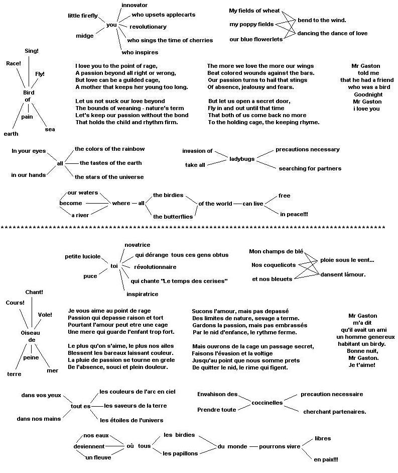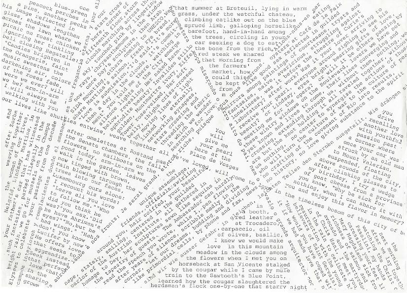 Although I was attracted by Kiki who was the life of the party, I was put off by the fact that she was married and I took up instead with her good friend Christianne. That lasted about six months before she broke it off, realizing that I was not about to leave Lindsay. It was a few years later and after the death of Kiki's husband that we began seeing each other in secret when Lindsay was on one of her frequent visits back to the States, and even sometimes when I took a long lunch hour. Kiki and I shared a love and fascination for art and the origins of things. When I first visited her apartment she found me examining the fossils that she had collected and artifacts from Africa and Oceania. And when I admired a watercolor she had made of a small boat in a pond, she generously offered it to me as a present. My first present to her was a richly illustrated book of ancient cave art from around the world. Later, on her last trip with her husband, she sent me a postcard with a beautiful view of the lush rainforest of Reunion, which became a shared passion for us in later years. It seemed that we would say goodbye when I returned with Lindsay to the States after my retirement from UNESCO in 2001, and I wrote her a poem at that time about escaping from the cage of our frustrations. However, over time as the let-down set in from the end of the UNESCO experience, I started to see her again and share with her the missions that I took around the world. Another woman in my life during the years in Paris was my UNESCO colleague Christine. We had met when I first arrived to live in Paris and we were neighbors on the 15th floor of the Miollis building of UNESCO, where I had the most spectacular office in the organization, the big corner office with huge windows overlooking all of Paris. In the poem that I wrote her at that time, I refer to the clouds passing by those windows, as well as the many languages and poetries that we shared. My Page Poem book has other poems to her.