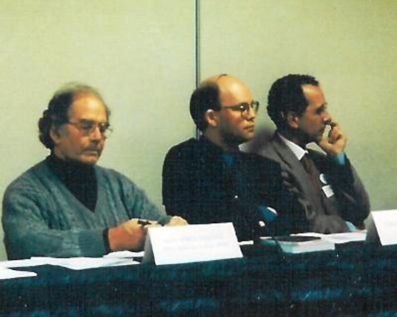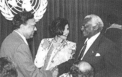Over the years, the culture of peace attracted a great variety of activists, and in some cases they caused more problems than if they had actually been agents working for the culture of war. I came to see that the culture of peace was a huge "bed," and I could hardly control who got into it with me. In the following photo are shown two of these crazy personalities, on the right Pierre Marchand and in the center Christian Renoux (On the left is Nobel Peace Laureate Perez Esquivel). As I have written more extensively in my Early History of the Culture of Peace, the idea for the International Year for the Culture of Peace came from Pierre Marchand, who was the founder and Executive Director of the NGO "Partage avec les Enfants du Monde", based in Compiegne, France, and a member of the International Fellowship of Reconciliation (IFOR), the oldest of the major international pacifist organizations. He wrote to all Nobel Peace Laureates on 28 February 1997, asking them to sign a letter to all Heads of State calling for an International Year of Education for Nonviolence for the Year 2000 and an International Decade for a Culture of Nonviolence from 2000-2010. Learning of this initiative, I went to visit Mr Marchand in April 1997, promised my support and suggested that he seek the support of Director-General Mayor. Pierre went to New York and visited something like 50 UN ambassadors to lobby for the initiative. As he explained to me, he would look each one in the eye and ask "Do you have any children? What are their names? What kind of world to you want them to grow up in?" Eventually, the initiative came under the responsibility of UNESCO (I arranged and took the minutes for many meetings between Pierre and Director-General Mayor), but in the beginning, singlehandedly, Pierre put the initiative on the UN agenda. But then began a crazy sequence of events. Christian Renoux, a member of Partage and of IFOR, for reasons I have never fully understood, brought charges against Marchand for embezzlement of funds from Partage, which eventually led to his imprisonment. Meanwhile, at IFOR, Renoux was centrally involved in a fight against the naming of a new President (if I recall correctly from Africa and not a Roman Catholic), which he "won" in the sense that the appointment was blocked and the entire staff was decimated. My good friend, the Secretary, was dismissed, and there was one suicide and one person who committed hereself to a mental hospital. As my friend explained, she wants visited Renoux at home and found in the entry-way a huge painting of San Sebastian with the arrows piercing his body. A good Catholic! Eventually, Pierre disappeared from sight after a bizarre set of incidents in South Asia where it was said he lost all his memory (I never knew if the stories were true), and Renoux went on to found his own organization for the International Culture of Peace Decade which refused to cooperate with the World Report that we were writing. I have mentioned Director-General Federico Mayor above. He, too, was a crazy personality, but he deserves more space, so I have devoted another page for him. Among Mayor's bad habits as Director-General was to give the same task to more than one unit and let them "fight it out" for funding, etc. We referred to it as his habit of "playing god." At one point he hired a new, high-level staff member for our unit, Ingeborg Breines and gave her responsibility for "culture of peace for women." The problem was that there was already a unit in the Social Science sector, headed by an Algerian woman for "culture of peace for women." Ingeborg is shown (center, back row) in the following photo of our unit from 1997, between me and Leslie Atherley, who the director at that point. Ingeborg did not want to work with me on the issues of culture of peace and women's equality (she was in charge of our involvement in the UN Beijing Conference), as her issue was simply changing the way that boys are brought up so that they would not be "macho." This was not a problem until Leslie retired as director, and she claimed that she should be the new director. Despite the orders from the Director-General that the office and facilities should be under my direction, she "occupied" the office for almost a year, refusing to leave, and I was left to fend for myself. Needless to say our relations were not good after that. After Mayor left as Director-General, it made little difference because the whole program was essentially abandoned. Another problematic personality was Anwarul Chowdhury. When he was ambassador from Bangladesh, Anwarul played the key role in the UN to get the Declaration and Program of Action for a Culture of Peace adopted by the General Assembly, in spite of persist opposition from all the rich member states. Later, under Secretary-General Kofi Annan, he became an under secretary-general at the UN as representative of the small member states, and continued to work for the culture of peace and for Resolution 1325 for women in peacekeeping, which he had introduced earlier to the UN Security Council. Here is a photo of him at the time he was advocating for the Declaration and Program of Action. He is on left with Nobel Peace Laureate Desmond Tutu on the right and the director of the UNESCO office in New York, Nina Sibal, in the center. Nina was quite ill with a brain tumor at that time, and very, very difficult to deal with. But let me stay here with Chowdhury.