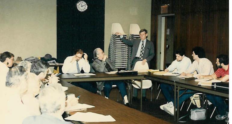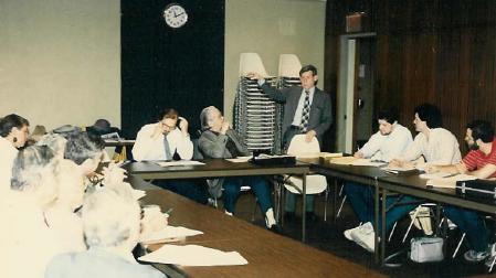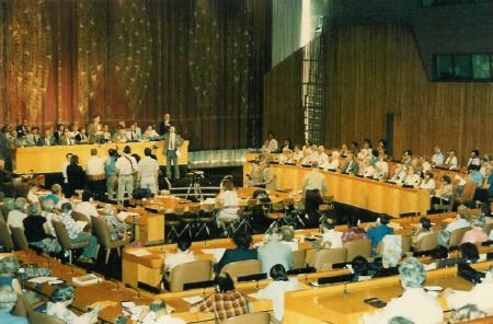 At the first meeting of the Ad Hoc Committee, on June 5, I proposed that "the project may include exchanges of petitions between local organizations, schools, trade unions, churches, city councils, amateur groups." I suggested that this would pave the way for followup work by which organizations would sponsor trips to visit their counterparts in the other country. During the rest of 1985 and early 1986, I attended a number of meetings of the Ad Hoc Committee and was instrumental in working with Howard Frazier and Lou Friedman of Promoting Enduring Peace to link our project with one that they were organizing: a trip for Soviet and American Peace Activists down the Mississippi River. I also restarted my correspondence with Nobel Laureate Bernard Lown and through him engaged the Physicians for Social Responsibility in the campaign. I also took responsibility to develop a model participation in the project in New Haven, where my friend Tom Holahan was on the Board of Alderman. Tom convinced the Board to formally endorse the project. We then organized schools, churches and other organizations throughout New Haven to support the Appeal and, on that basis, we prepared a beautiful manual, of which I still have copies, which we circulated throughout the US for participation by cities. Tom became one of the 26 original US and Soviet signatories (see the final, signed copy). Later, in 1990, Tom and I wrote a short article together for the short-lived Bulletin of Municipal Foreign Policy. On August 8, 1986, the anniversary of the bombing of Hiroshima, the final version of the document, as amended by the Soviet and American participants on the Mississippi River Cruise and called an "Appeal" rather than a "Treaty", was signed in a ceremony at the ECOSOC chamber of the United Nations (photo below). There were 300 people at the event, and Robin Ludwig, from the Secretariat of the International Year of Peace (1986) commented that "the public was really doing what the UN was established to do: make peace." We held a press conference at the UN Press Room, but got very little press coverage for the event in the United States (I don't know about overseas press). While the Mississippi Peace Cruise was covered by an extensive article in Time Magazine thanks to the work of Lou Friedman, the article did not mention of the Peoples Peace Appeal.
