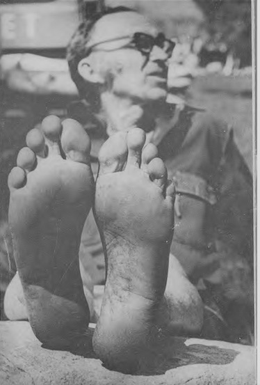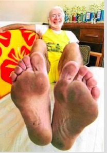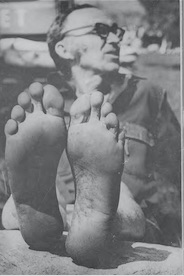 It was the great barefoot runner Charlie ("Doc") Robbins who got me started running barefoot. He used to run with the college students at Wesleyan, although he was already in his 50's when I first met him. At Wesleyan he found olympic-class runners such as Jeff Galloway, Amby Burfoot and Bill Rodgers. And he liked to run with the pretty girls as well! I was running well in my late 30's, but was starting to get cramps in my knees after 5 or 10 miles. Charlie explained that it was because my foot-plant was not stable and the knees had to compensate for the instability, and so eventually they cramped. "Run barefoot like me," he said, "and your foot-plant will be much more stable." And sure enough, he was right. Once I got used to running barefoot I never again suffered from cramping at the level of the knees. Like other runners, I could develop achilles tendonitis, plantar fascitis or shin splints, and even a strain of the groin muscles, but not knee cramps. I have a rare book that I treasure, "Charlie Robbins' Scrapbooks" in which he provides a detailed history of his running career (although almost nothing about his barefoot running which he apparently took up in the 70's). The photo of him and his feet above is on the back of the book. And in the book, I especially treasure the following quotation: An interesting race in 1979 was the Vito Bonaiuto five miler in June where the winners of the over 40 men and women and the over 50 classes all ran barefoot. This was me, Carol McCall my reluctant protege runner, and Dave Adams a Wesleyan psychology prof who had been barefoot running only two years. I still don't see why more people don't try it - at least in training. It's really fun and something different. Charlie passed away at age 85 in 2006, having run well up until a few years of his death. But he lives on vividly in the memories of runners of my generation, and when we get together before and after the races, we often trade stories about him.