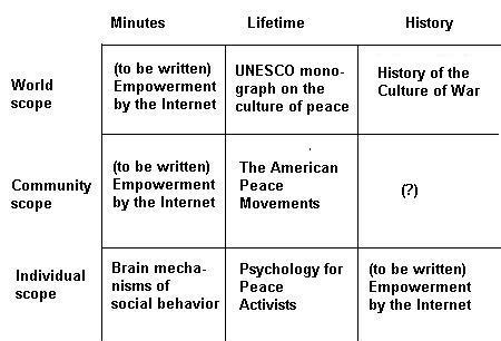 As far as social movements were concerned, I had gone as far as I could with the history of American peace movements, and was convinced that a similar analysis could be done for other social movements in other countries as well. Once I was at UNESCO, I could apply a similar analysis on a global scale which I did in the monograph, looking at culture of peace on the levels of international, national and local levels. This left me several cells yet to fill. For many years I worked on materials for a World History of the War/Peace Dialetic. Although in recent years I have put less energy into it, there are several drafts waiting to be moved further forward. [note added in 2009. I have now completed and published this work under the title History of the Culture of War. For a long time I did not see how to deal with world and community interactions on a minute-by-minute level or how to deal with the evolution of the individual's or community's capacities over the span of recorded history. Finally, I decided that this could be done using the Internet and its precedents as a reference point for how human social interactions have evolved. Having worked by using Internet for several years, I continue to think about how to approach this analysis.