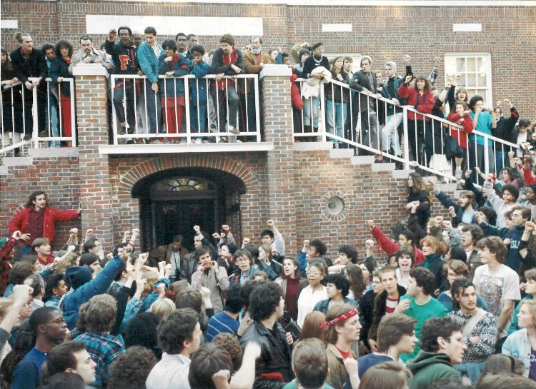 The photo here is one for which I am especially proud. It was taken during the days of the student activism in 1988 for divestment from South Africa. Here was a case where the students actually played a pivotal role in history. Bitterly resisted by the University Administration and Board of Trustees, and given little support from the faculty, the students forced Wesleyan to sell its investments in companies doing business with the Apartheid regime in South Africa. It turns out in retrospect that Wesleyan divestment came at a key moment which inspired other universities and institutions to divest, and the divestment campaign played a major role in forcing the Apartheid regime to enter into talks with Nelson Mandela, leading eventually to his freedom and the allowing of free elections. Several years later I taught a small seminar about the divestment campaign and the students wrote excellent historical papers documenting what had happened in detail. Almost always, mobilizations were student-led and inspired, but sometimes I was able to mobilize faculty support for the students, which was helped by my consistent support for faculty benefits in the local chapter of the American Association of University Professors. In the last few years before leaving Wesleyan for the UN, the students in my courses of Psychology of War and Peace organized major student conferences on the campus, one consisting of a US-Soviet Student Summit, and another dedicated to solidarity with the UN Conference on Environment and Development in Rio.