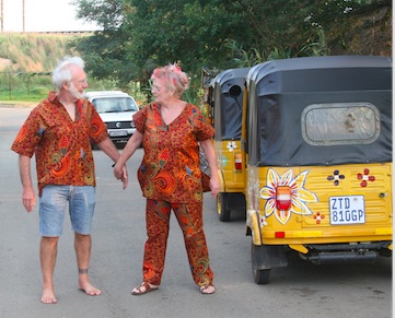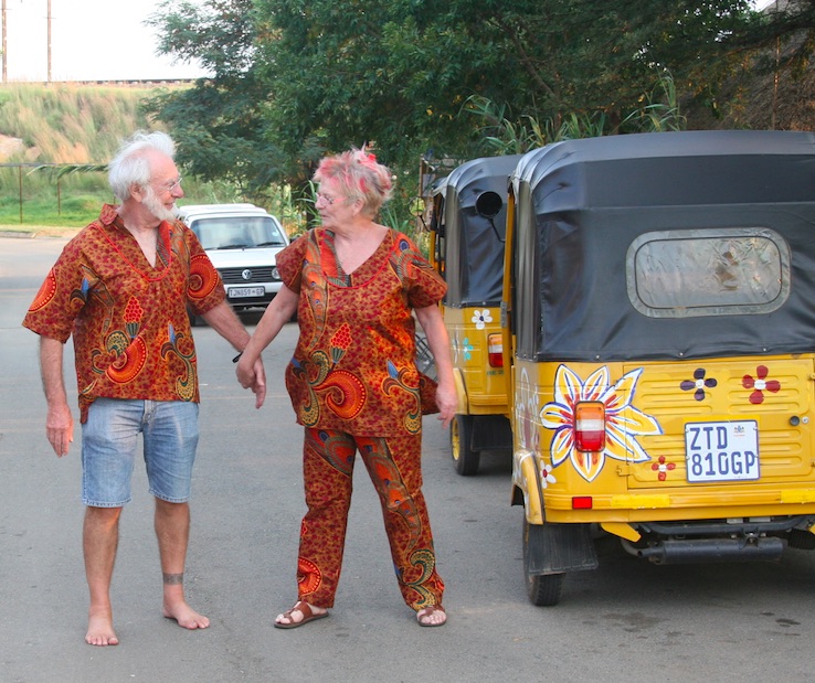 I cannot fail to describe our trip to South Africa in January/February 2015, coinciding with my participation in the conference on peace tourism organized by Lou D'Amore, and including Enzo as well as me. We visited Capetown, Eshowe (Zululand), the game reserve of Hluhluwe and Soweto/Johannesburg. In Eshowe we went for a day trip with a guide and experienced a typical family and village, including the round ancestors' hut. In Hluhluwe, we stayed in a tent and met lots of rhinoceros, elephants, antelopes, wart hogs, buffalos, a hyena who came for a piece of meat at our barbecue, monkeys and birds who stole our food, and even a couple of lions, one during an unforgettable night safari. Our stay at Lebo's backpackers in Soweto was especially remarkable, although marred by Kiki's terrible attack of sciatica. The suits that you see in the photo were tailor-made for us there, and we are standing next to the little vehicles with which one tours Soweto with an excellent guide. We went to the Apartheid museum and the museum that commemorates the Sharpeville massacre, and, thanks to the help of Nestor, I had an excellent meeting with men who had been in the Mbeke cabinet, and who want to apply culture of peace to pan-africanism.