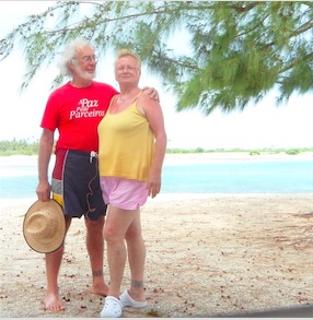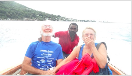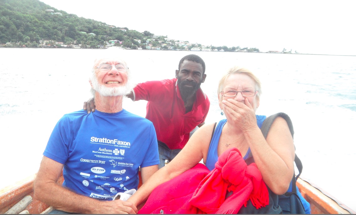 In Domenica in 2014 we stayed with Frank and Caroline in their guest house at Scotts Head on the southern tip of the island - where I had gone with Lindsay a few years before - and where there is a bay with coral reefs that is perfect for snorkeling. Each morning they gave us a bottle of fresh squeezed fruit juice from yet another of their fruit trees that Frank had planted when he returned to the island from England where he was a professional gardener. As always the snorkeling was wonderful, but difficult this time for me because of my medical condition. I couldn't urinate but had to catheter myself thanks to the botched injection of botox into my bladder by my urologist. Kiki is laughing in the photo because of the way we had to escape from the island. The last night there was a terrible tempest that closed all the roads with landslides and we couldn't get past them to go to the airport in our rented jeep. So we hired a little fishing boat to take us, but the guy was dead drunk and the voyage was a riot!