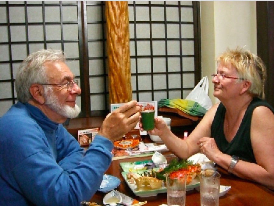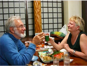 We already had made some wonderful voyages before the divorce. One of the most exotic was that of Japan in 2006. I was invited by Takehiko Ito and the Japanese Culture of Peace Association (See photo). But all the planning was done by Kiki who had us travel to Kyoto and to the North, and to stay in the traditional ryokans where we slept on thin mats on the floor in rooms lit by translucent paper walls. One of the funniest things was taking baths in a ryokan since they were co-ed steam baths. We discovered Japanese cuisine, some of the finest we have ever tasted, although sometimes, unable to speak Japanese, we ended up with some unexpected results! The photo here was taken in a restaurant that served only crab, but was very elegant - something like 6 stories, each with little private rooms. A memorable side trip was to Kakunodate, an ancient samurai village on the West Coast at the height of the cherry blossom time. Also, we were especially impressed with Iwate-San and Fuji-San, the beautiful mountains that are called "San" as you would address a venerable person.