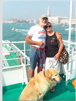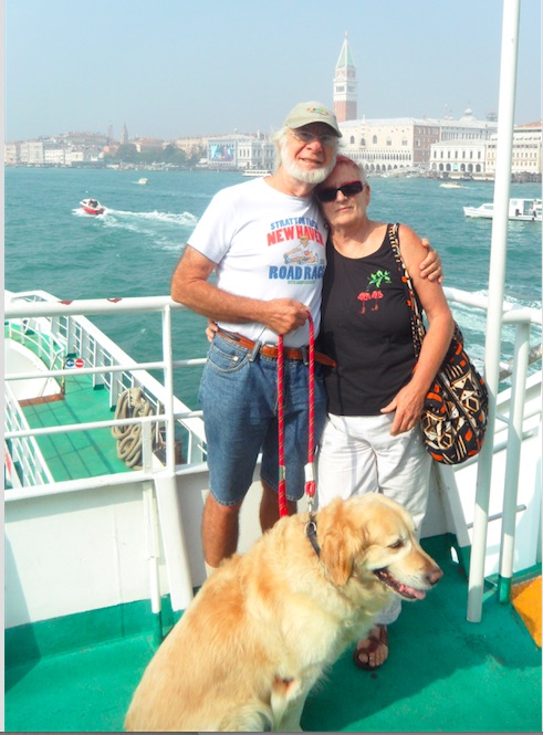 Another exotic trip was to Venice in 2013, driving there with Marcel, our golden retriever in Lili, the cute little red convertible of Kiki. We stayed in a magnificent old mansion furnished with fine old furniture and took the vaporetto boat into the city each day. Marcel was a big hit, but it was difficult because he was forced to wear a muzzle on the vaporettos. And, of course, we explored the maze of old streets and canals. This was my fourth visit to the magical city, having gone previously with Susan, Nina and Lindsay. On the way, we stopped in the Jura and stayed with Kiki's old friends Thierry and Manu and their kids, and then in Geneva with the family of Joe, Kiki's first husband. I went into the city each day to the peace conference organized by Oliver Rizzi-Carlson.