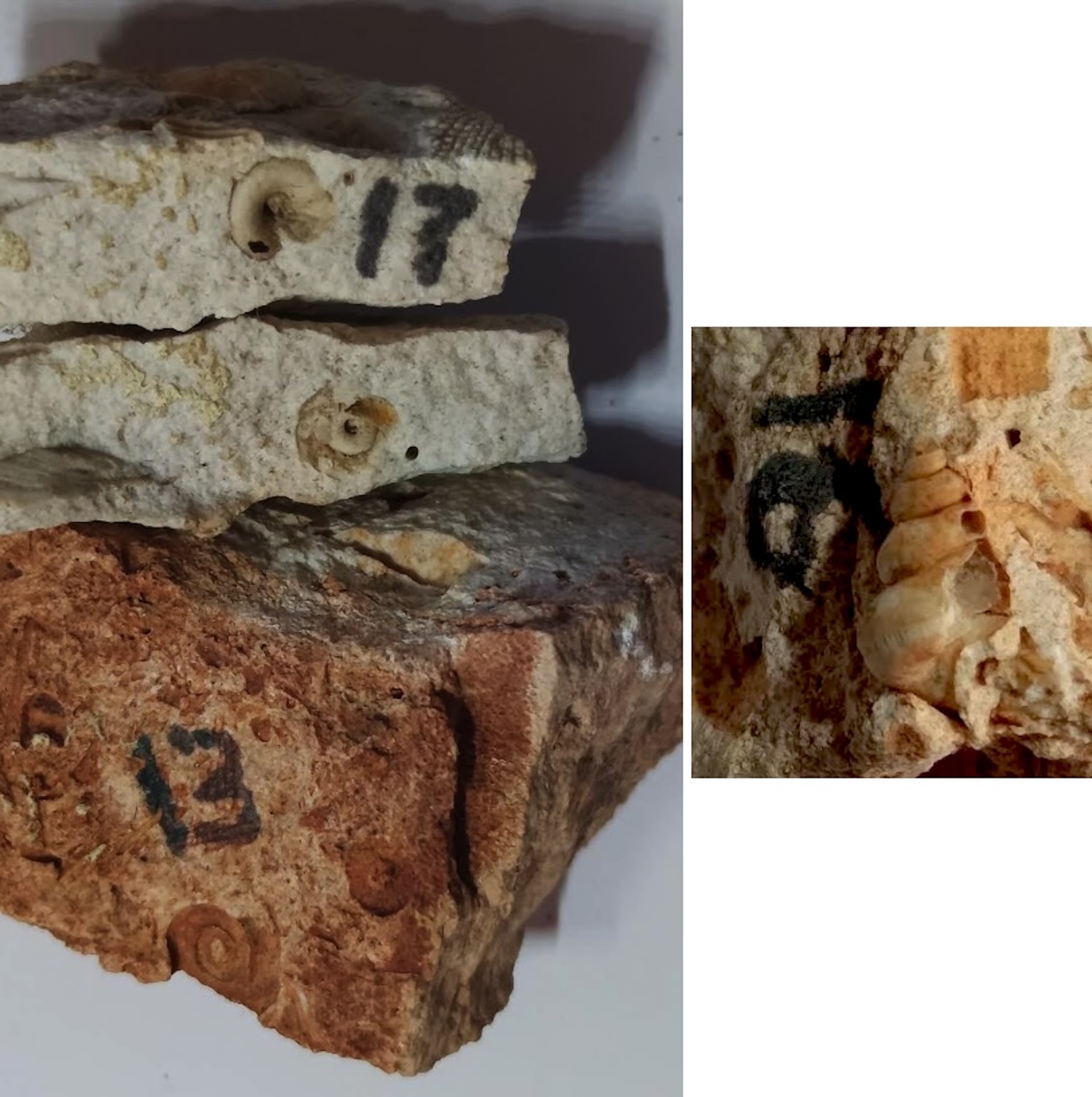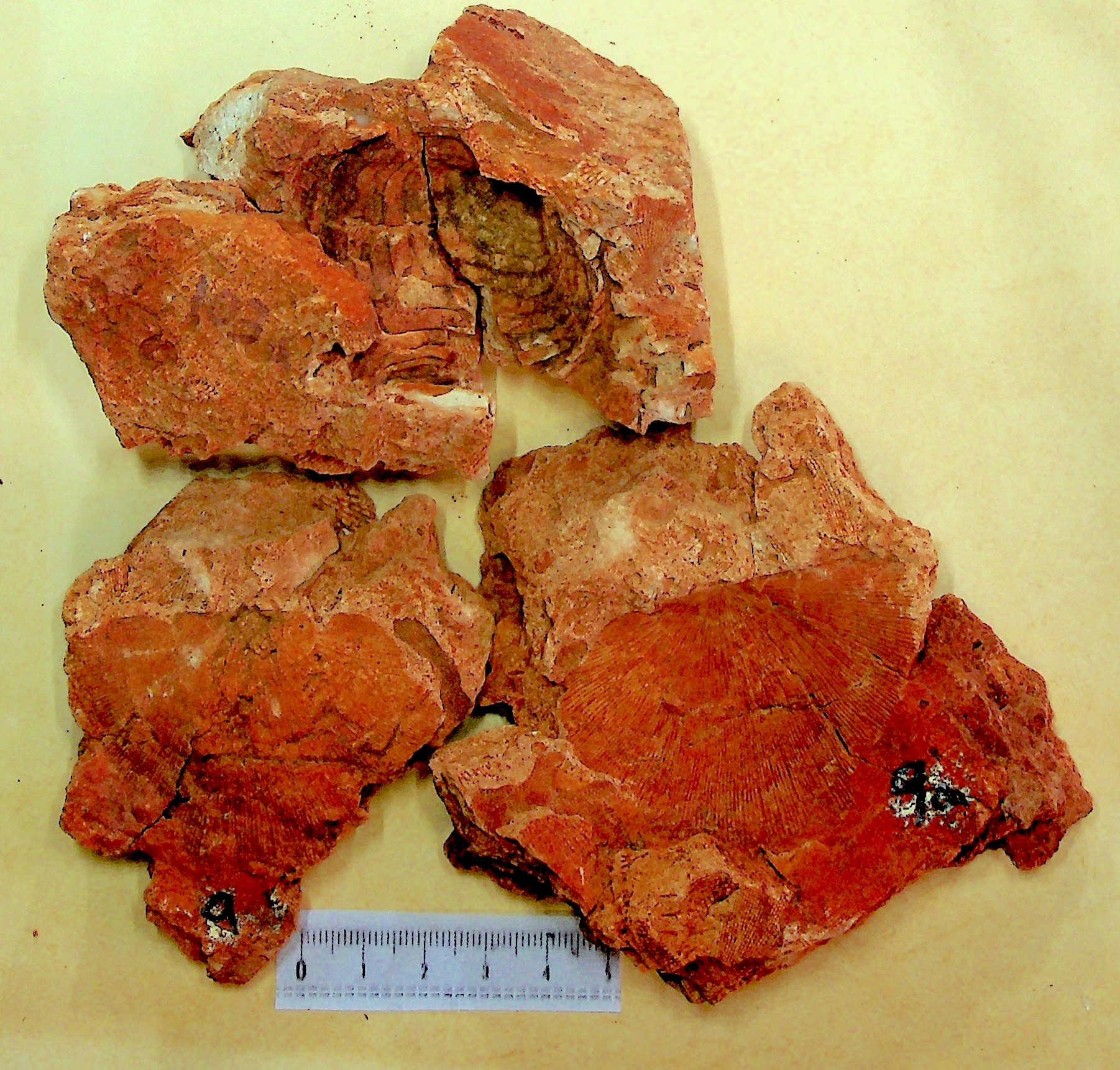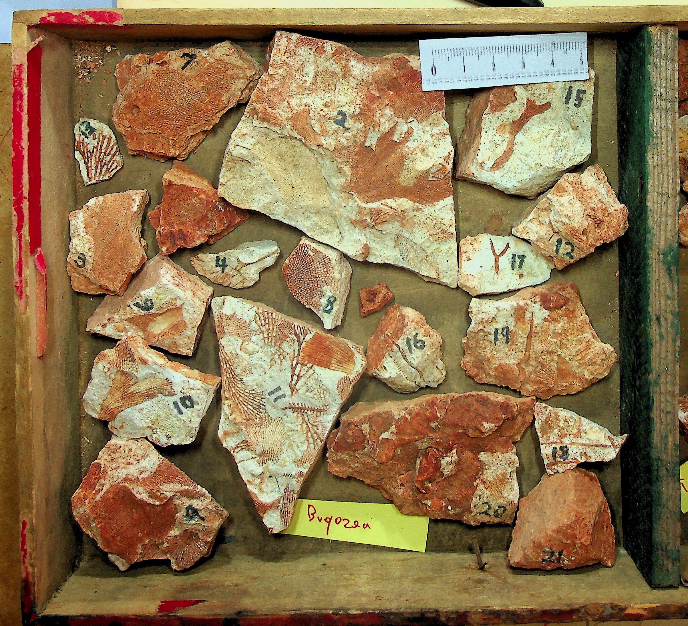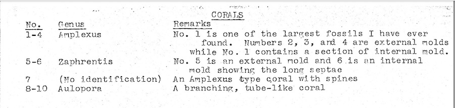 Corals. 4 different genera: General photo with identification page and close-up photo. Close-up of Zaphrentis with comparison to a specimen from another rock.