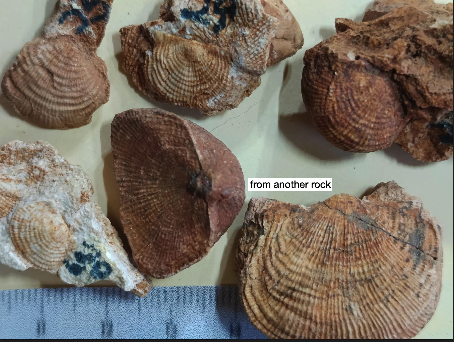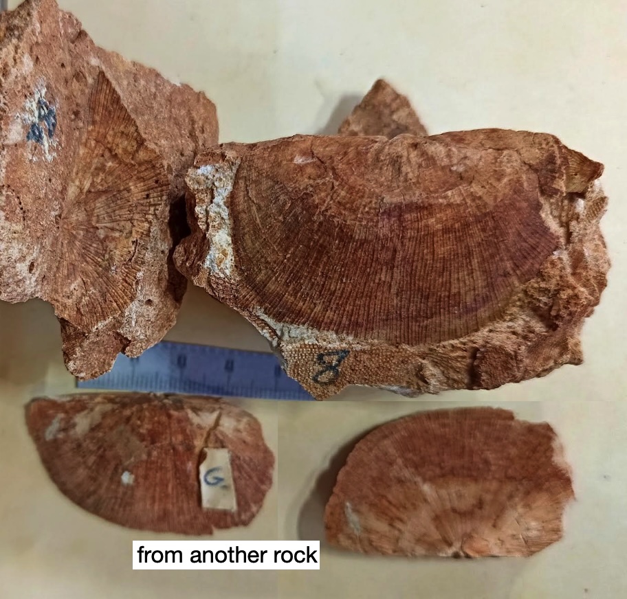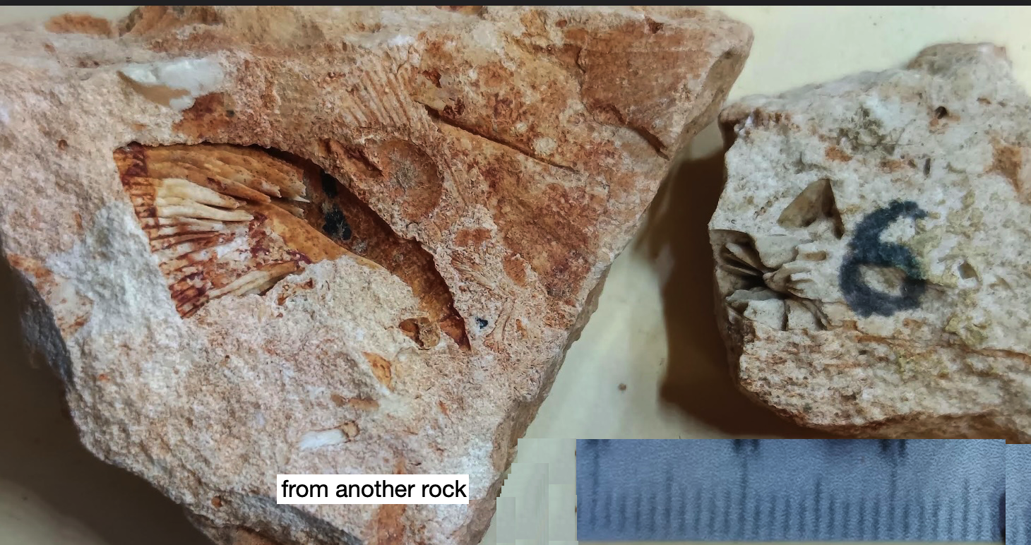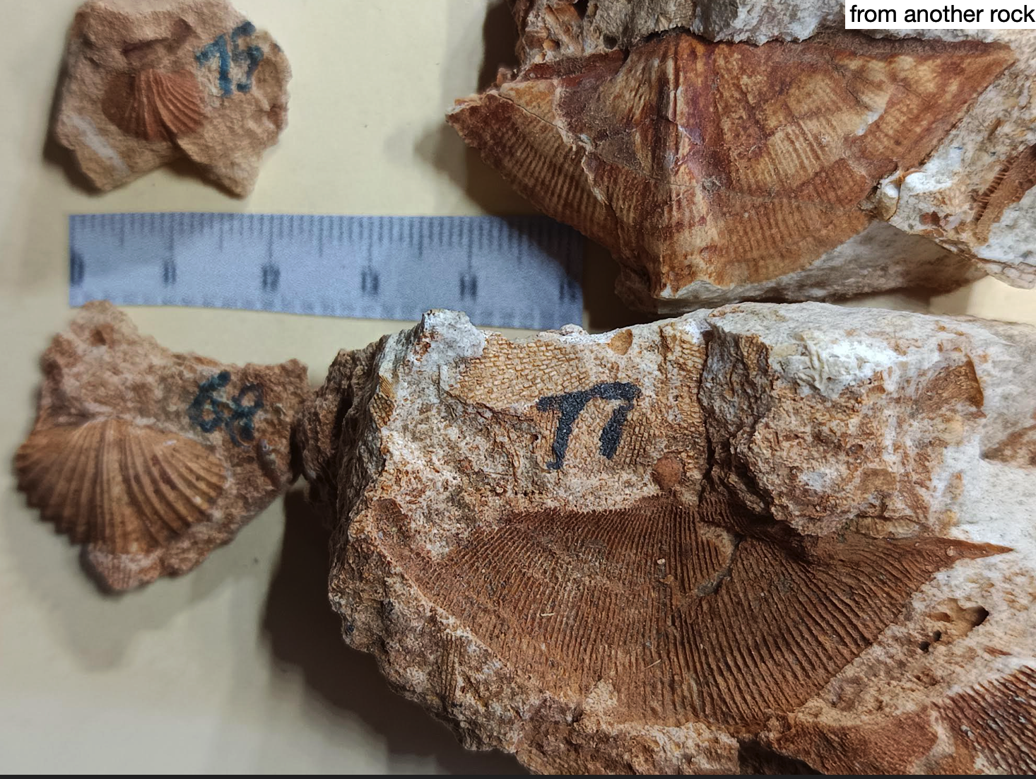 To provide further detail about some of the brachiopods, here are photos of six species with complete interior moulds (both pedicle valves and brachial valves) from other rocks along with an identification page. Also here is a photo of the lophophore brachidia from the inside of an unidentified brachiopod, something that is rarely preserved in the rocks that I have found.