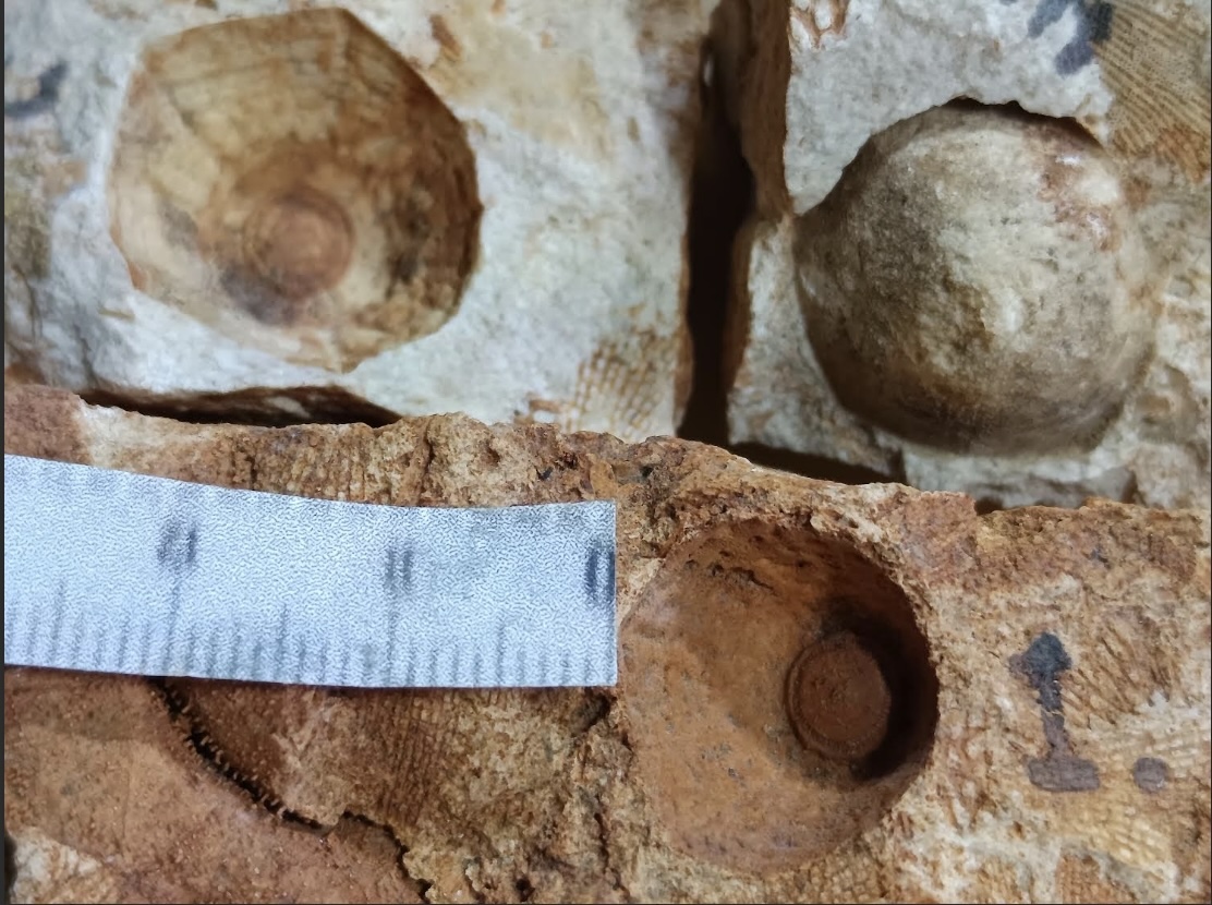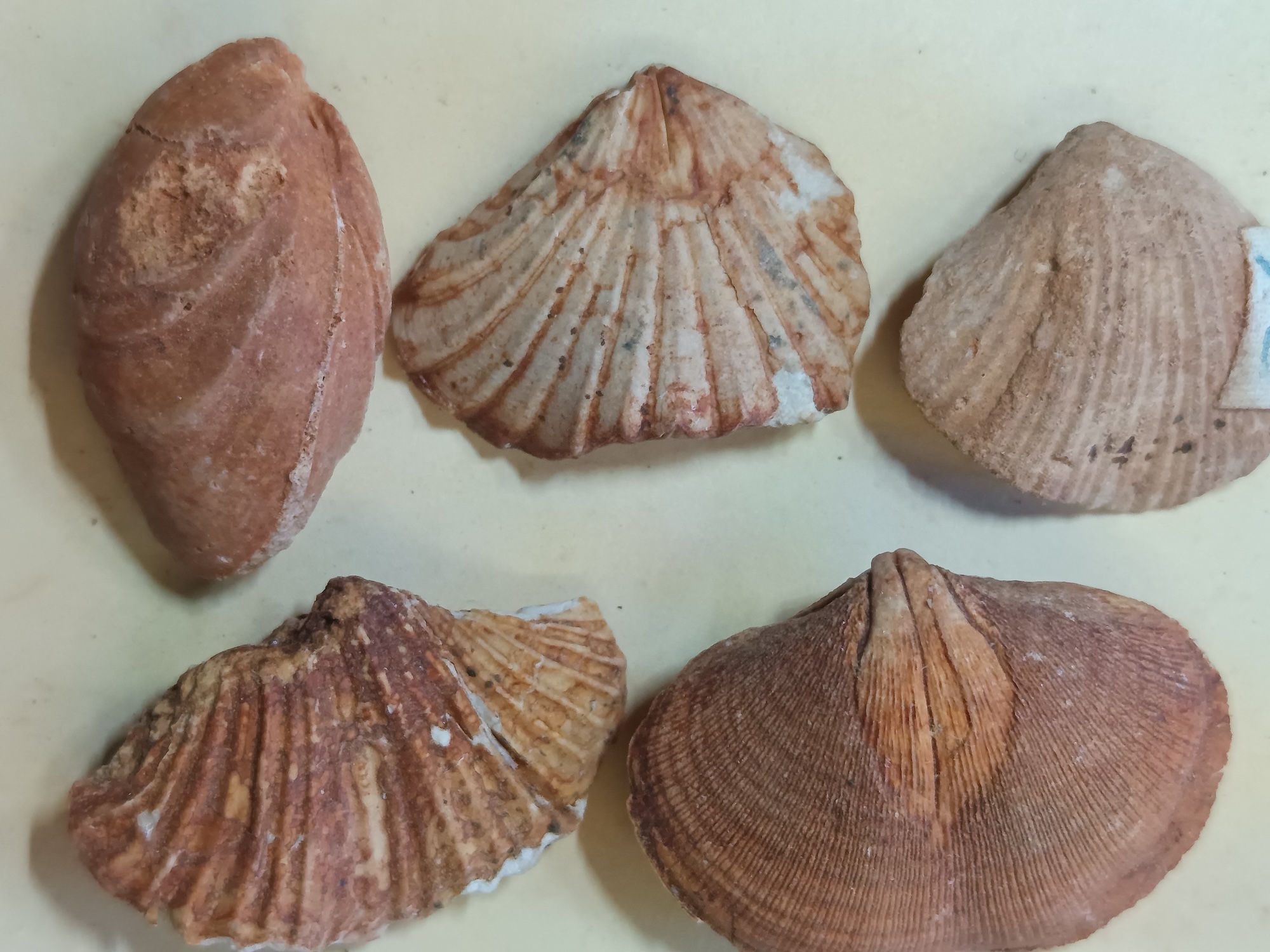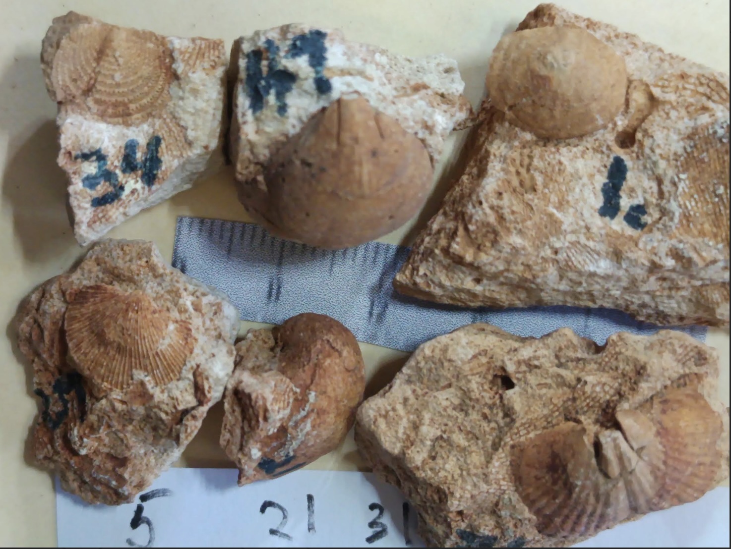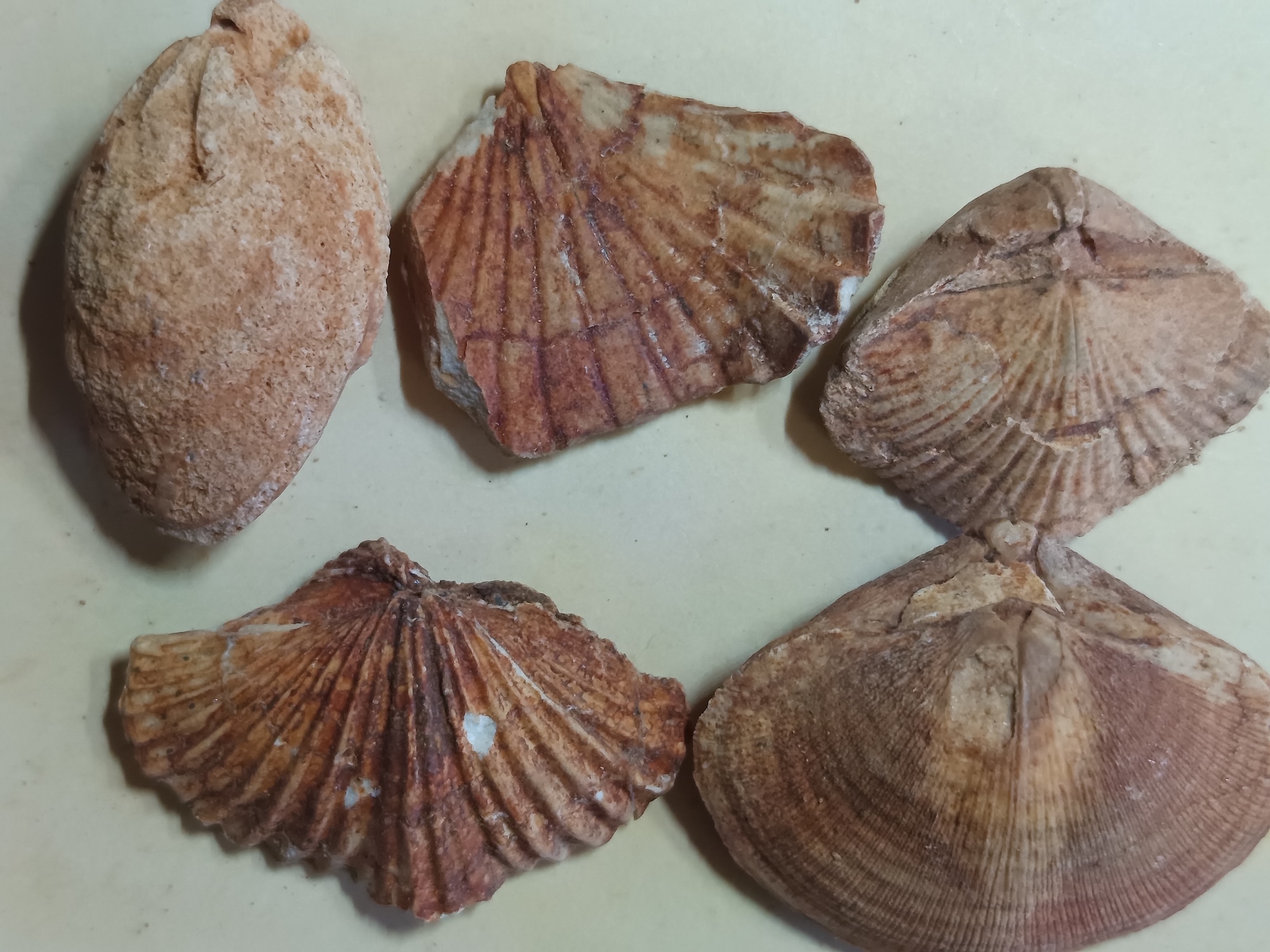 To provide further detail about some of the brachiopods, here are photos of six species with complete interior moulds (both pedicle valves and brachial valves) from other rocks along with an identification page. Also here is a photo of the lophophore brachidia from the inside of an unidentified brachiopod, something that is rarely preserved in the rocks that I have found.