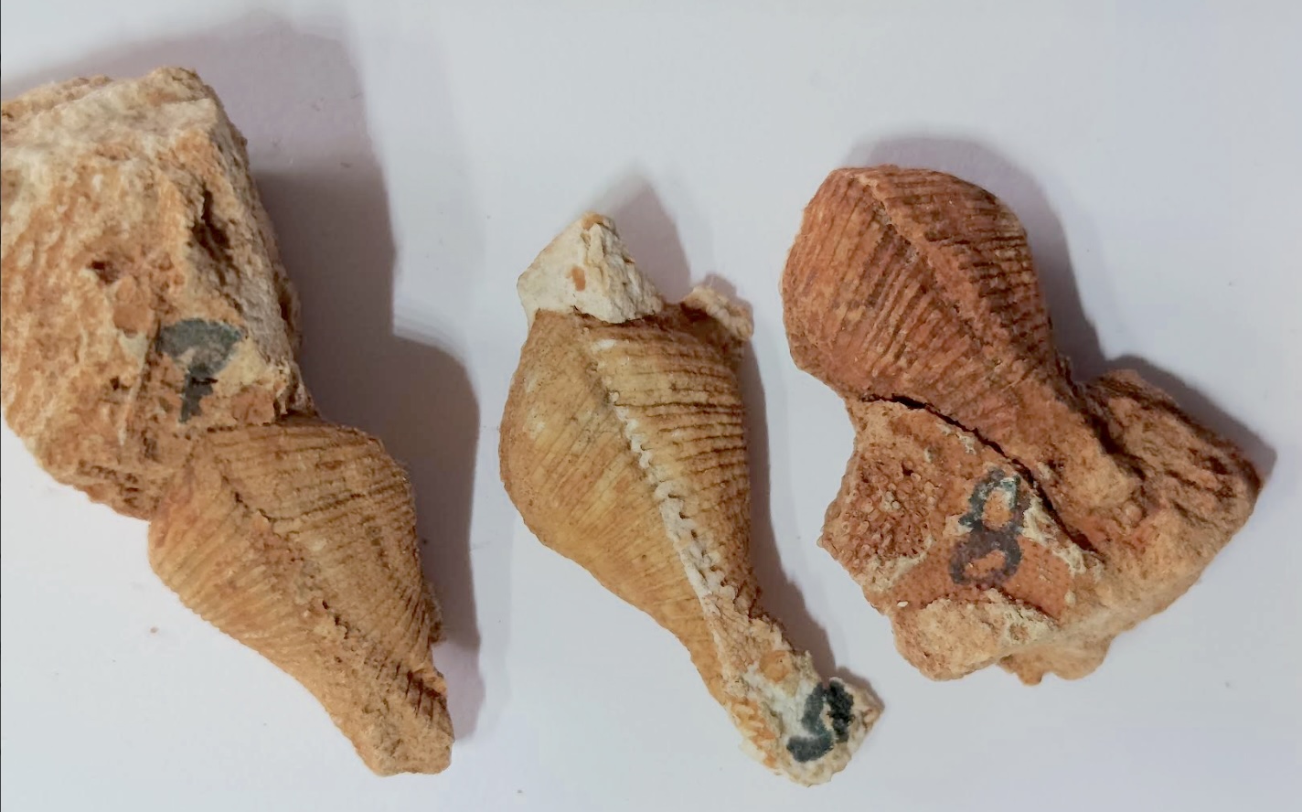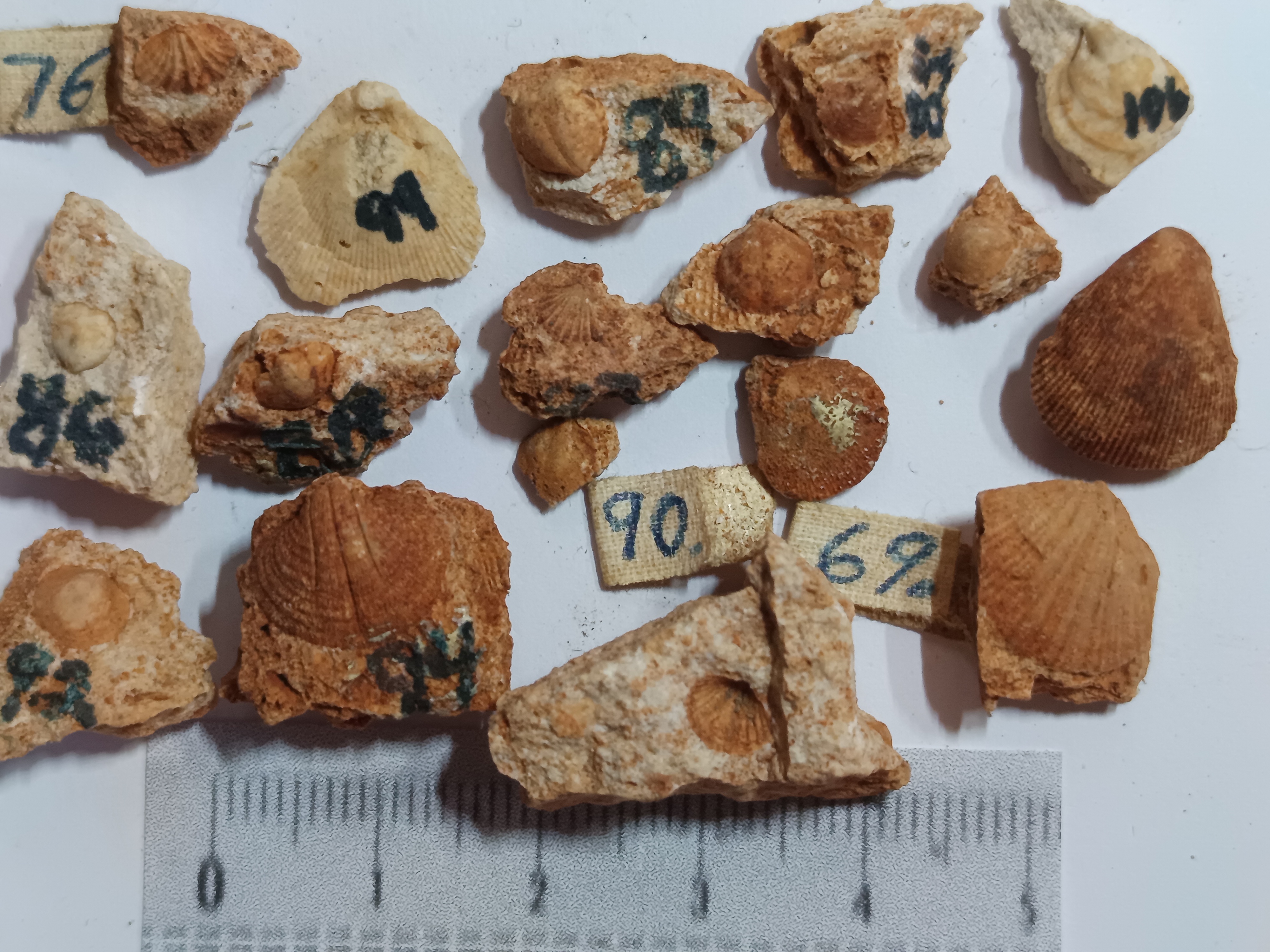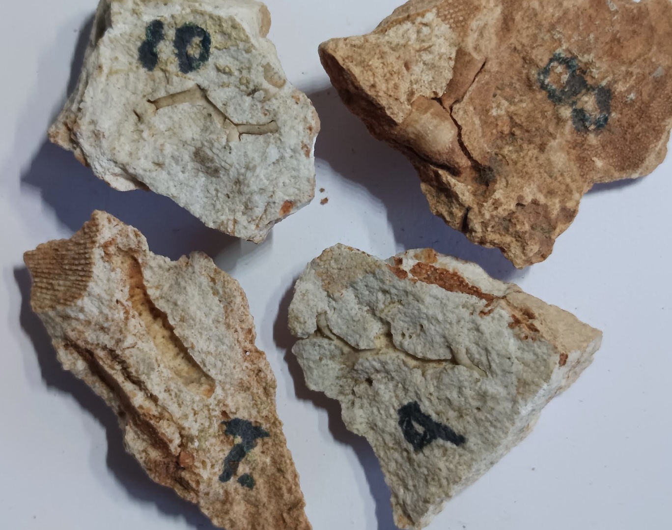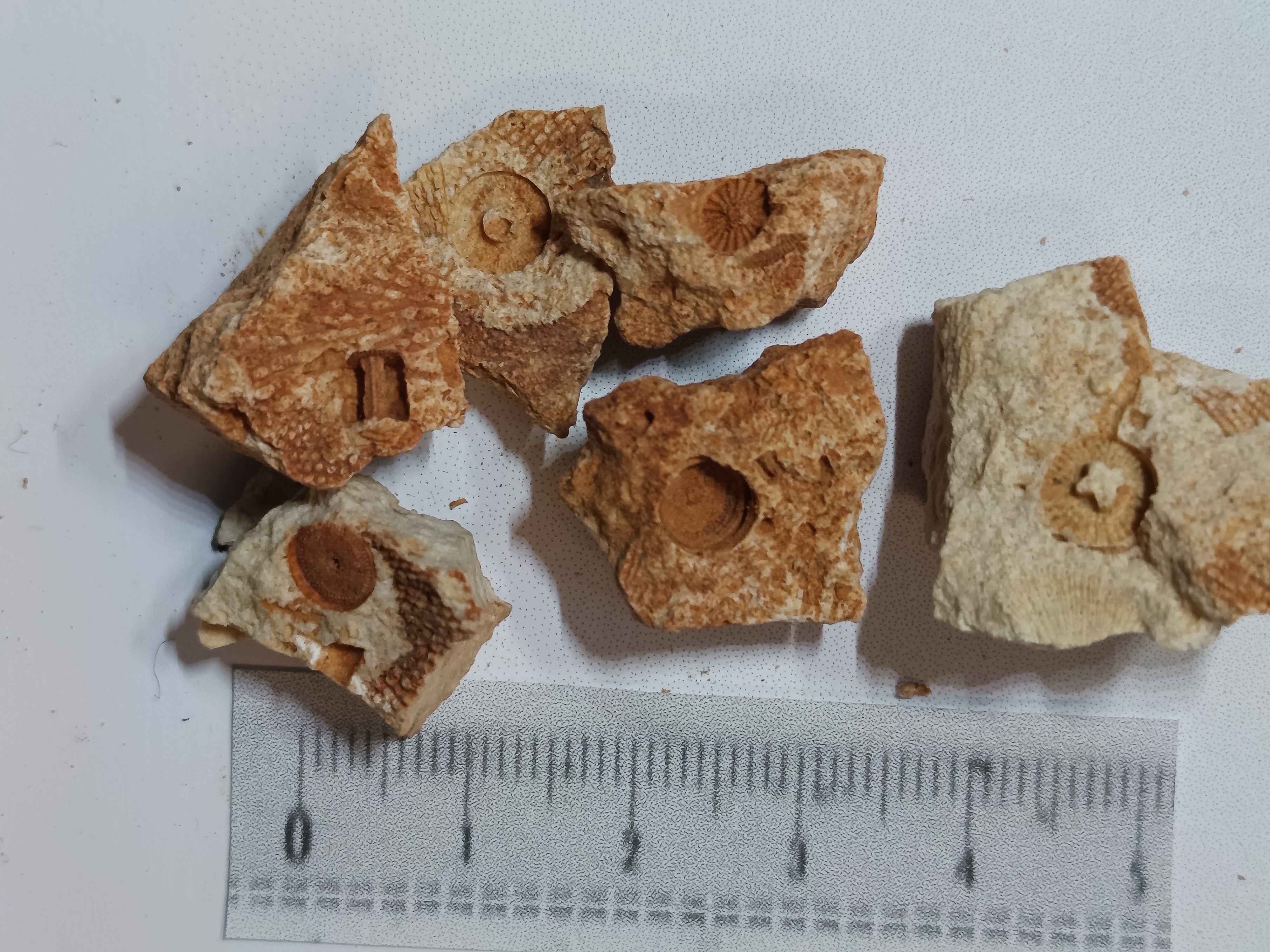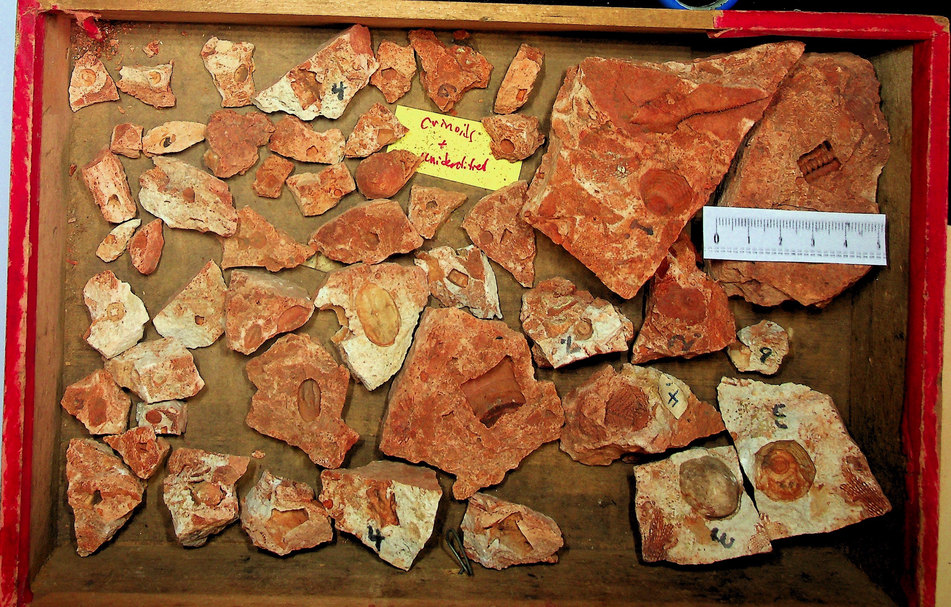 Unidentified fossils: Photo up close. Those without numbers may be parts of crinoids. Number 4 is a mystery.