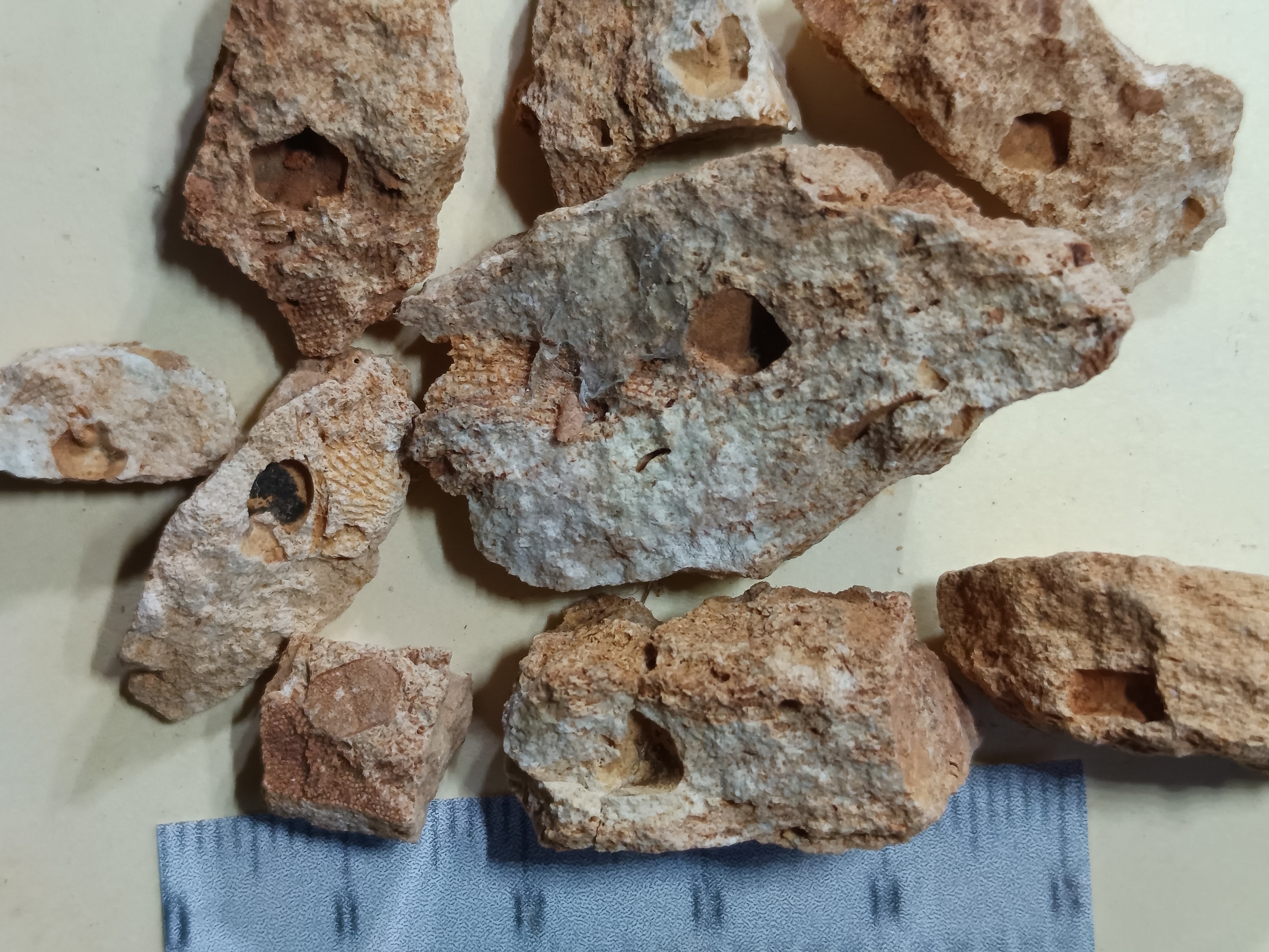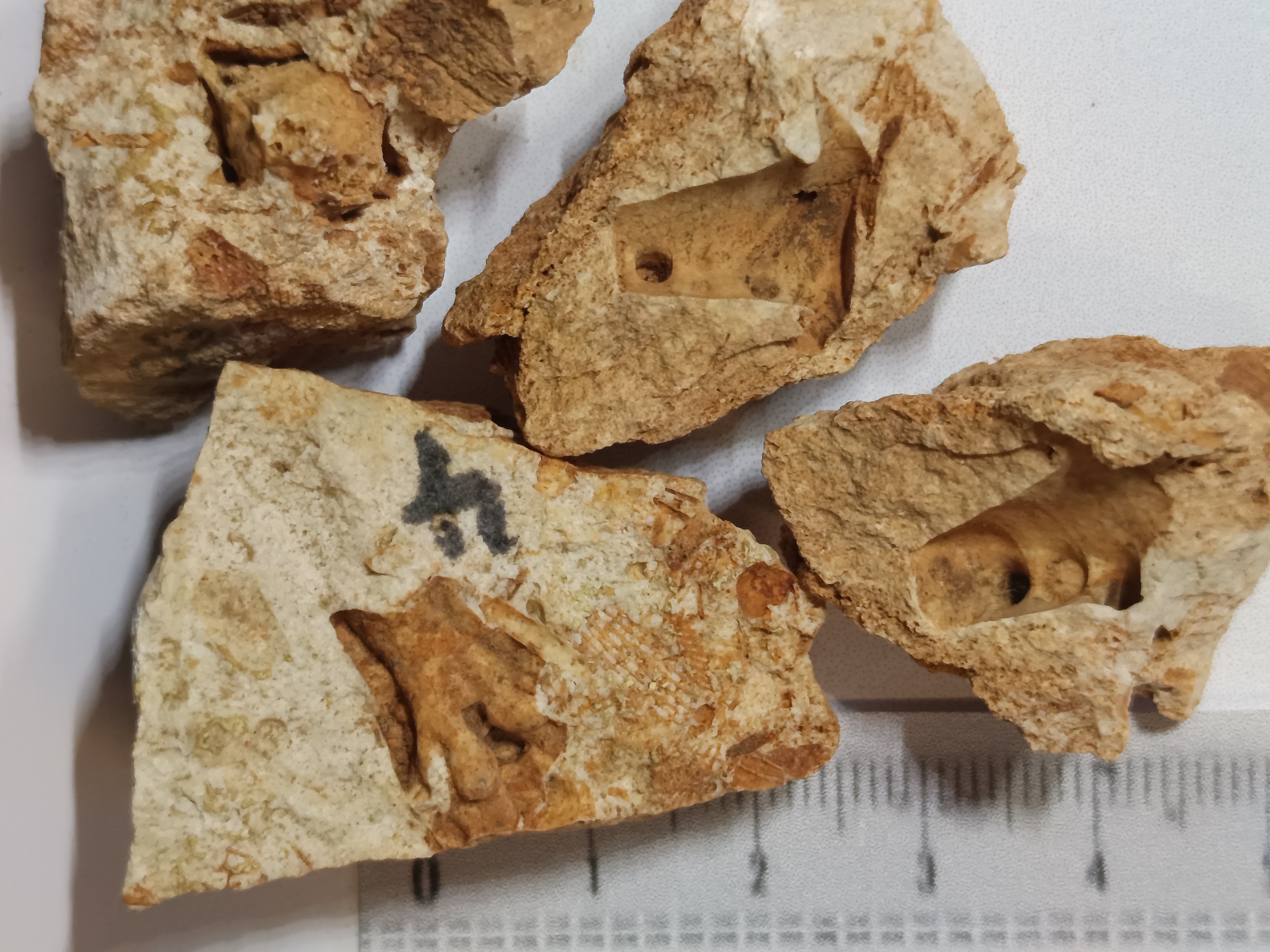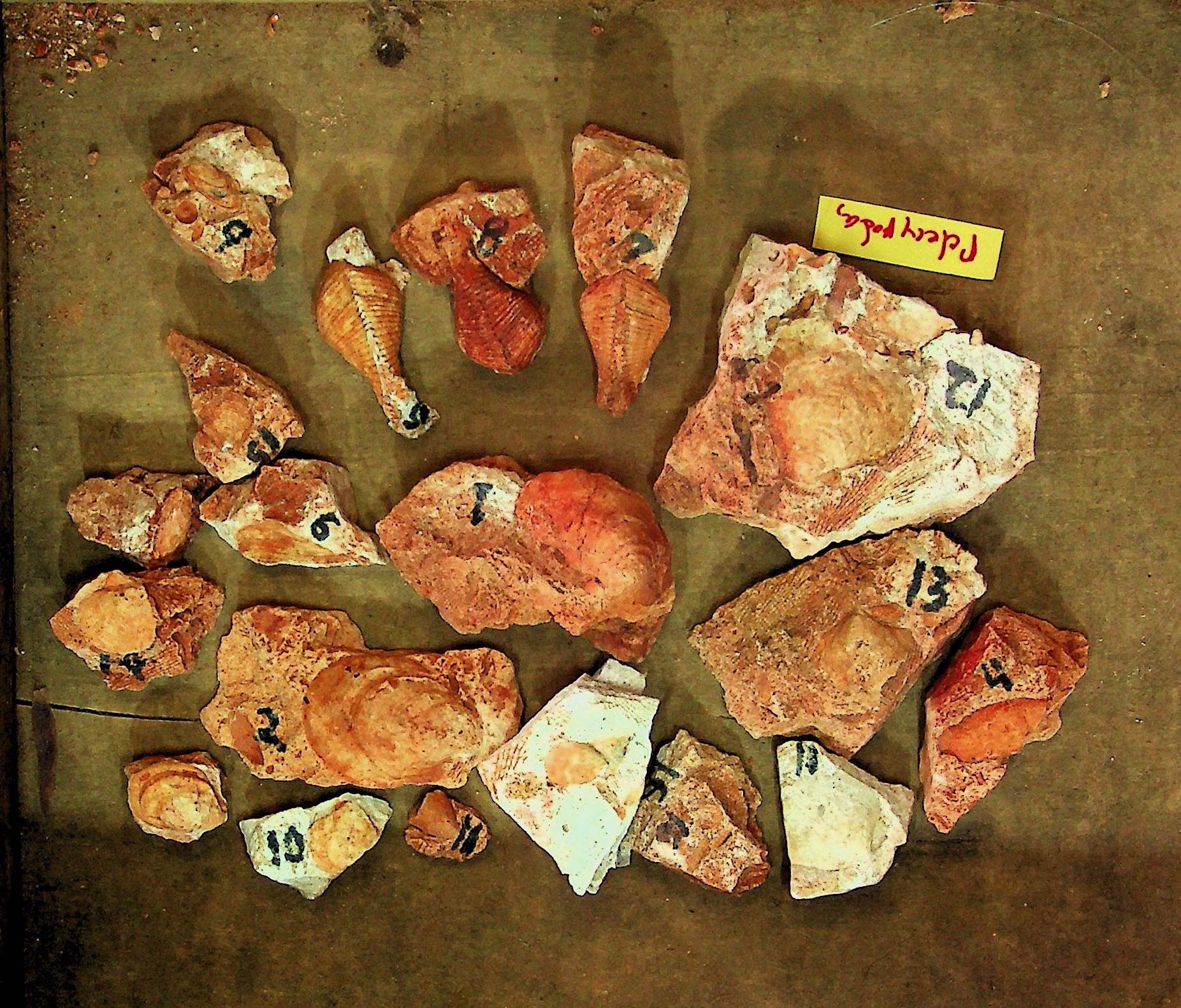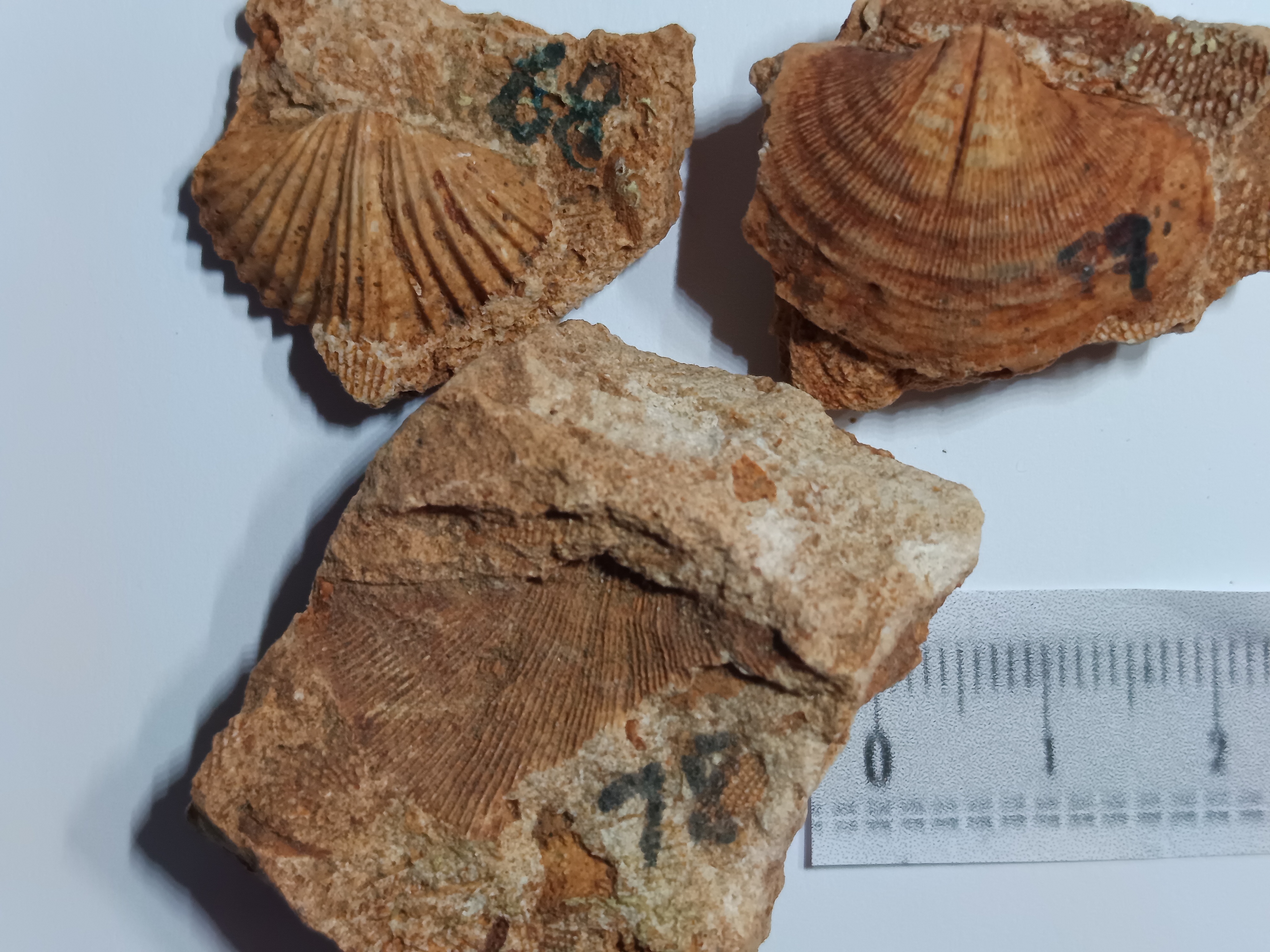 Unidentified fossils: Photo up close. Those without numbers may be parts of crinoids. Number 4 is a mystery.