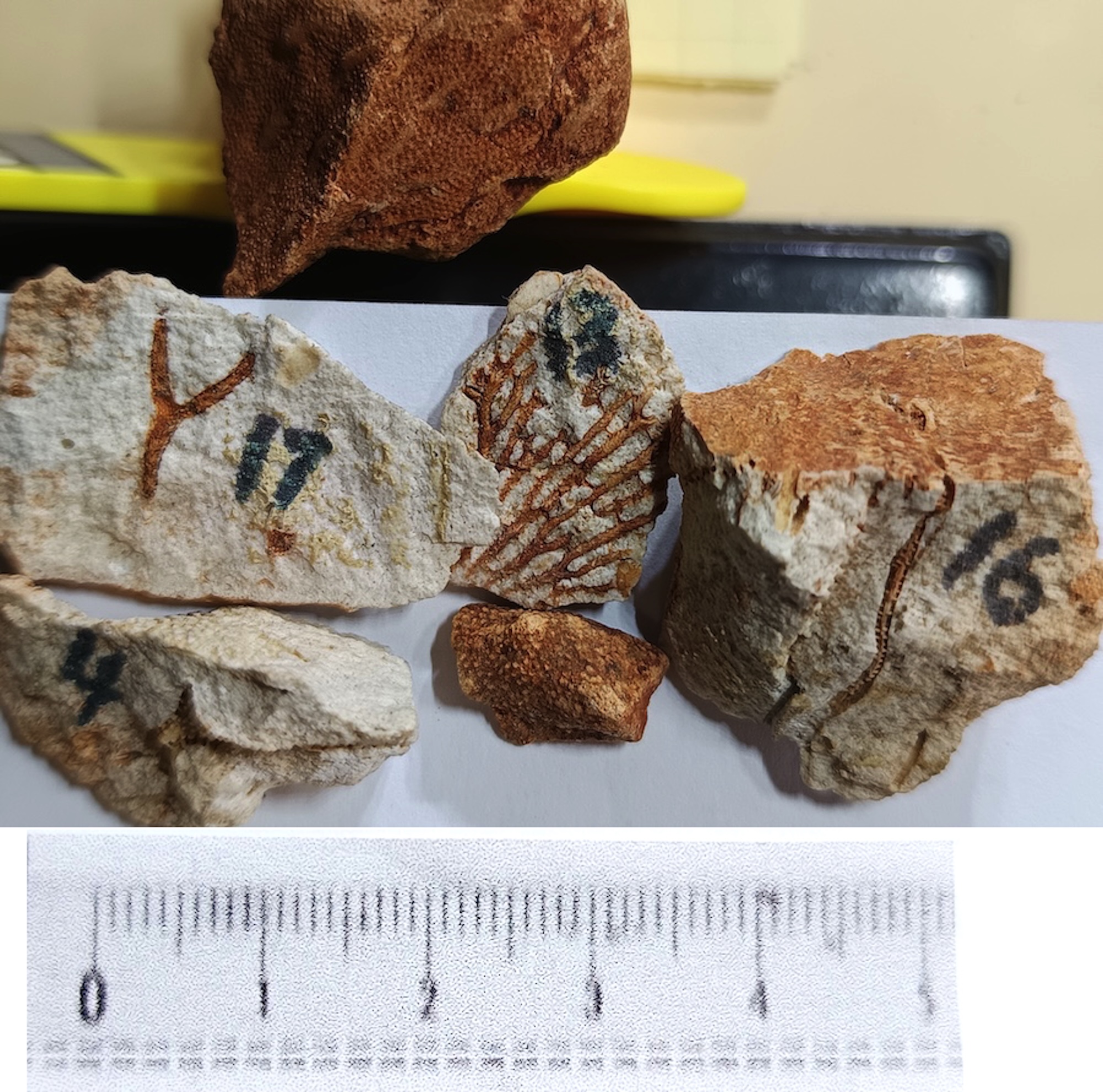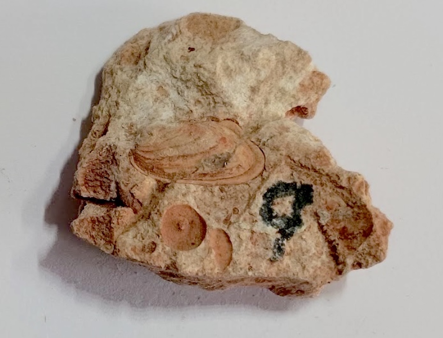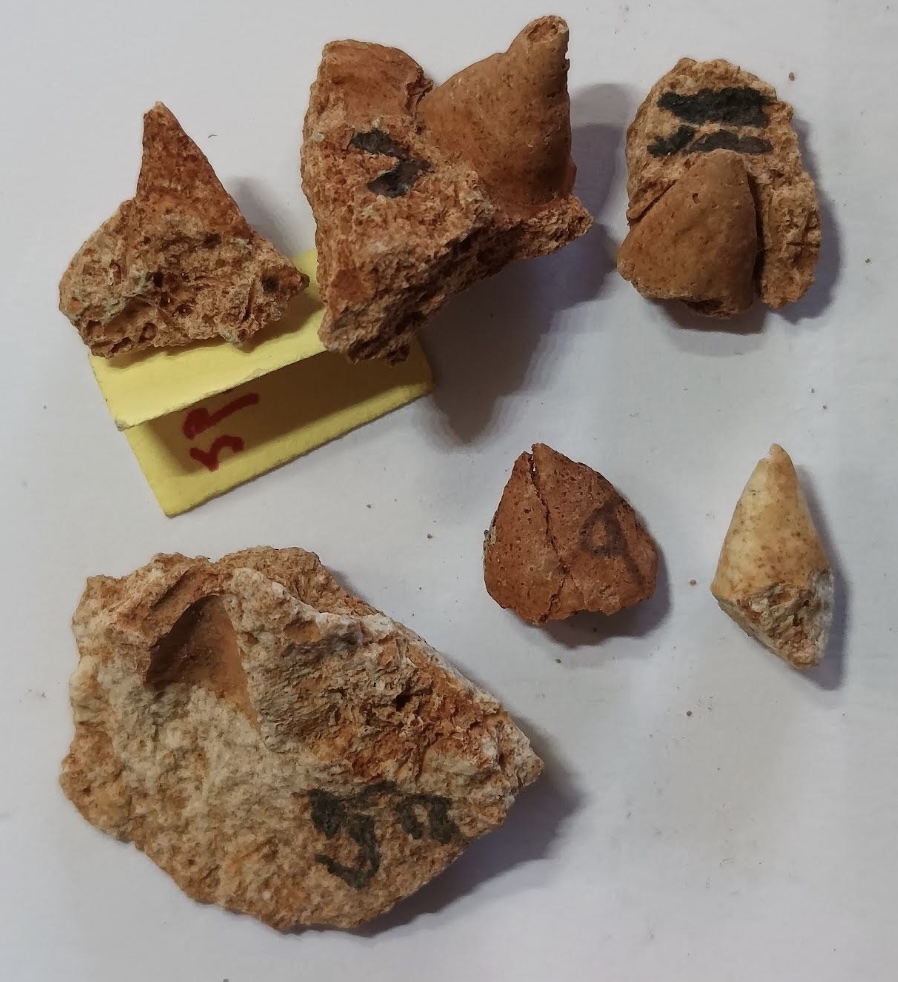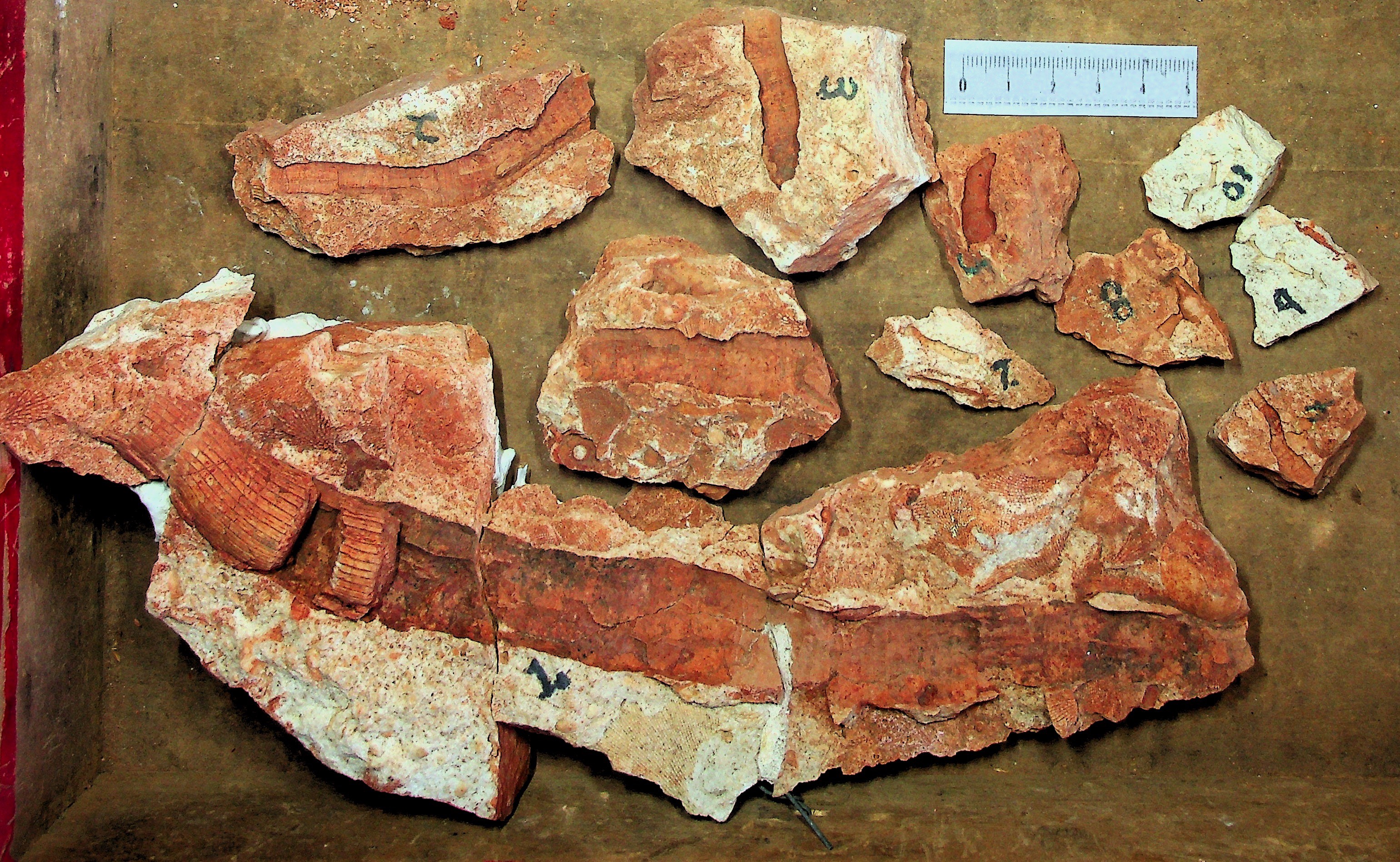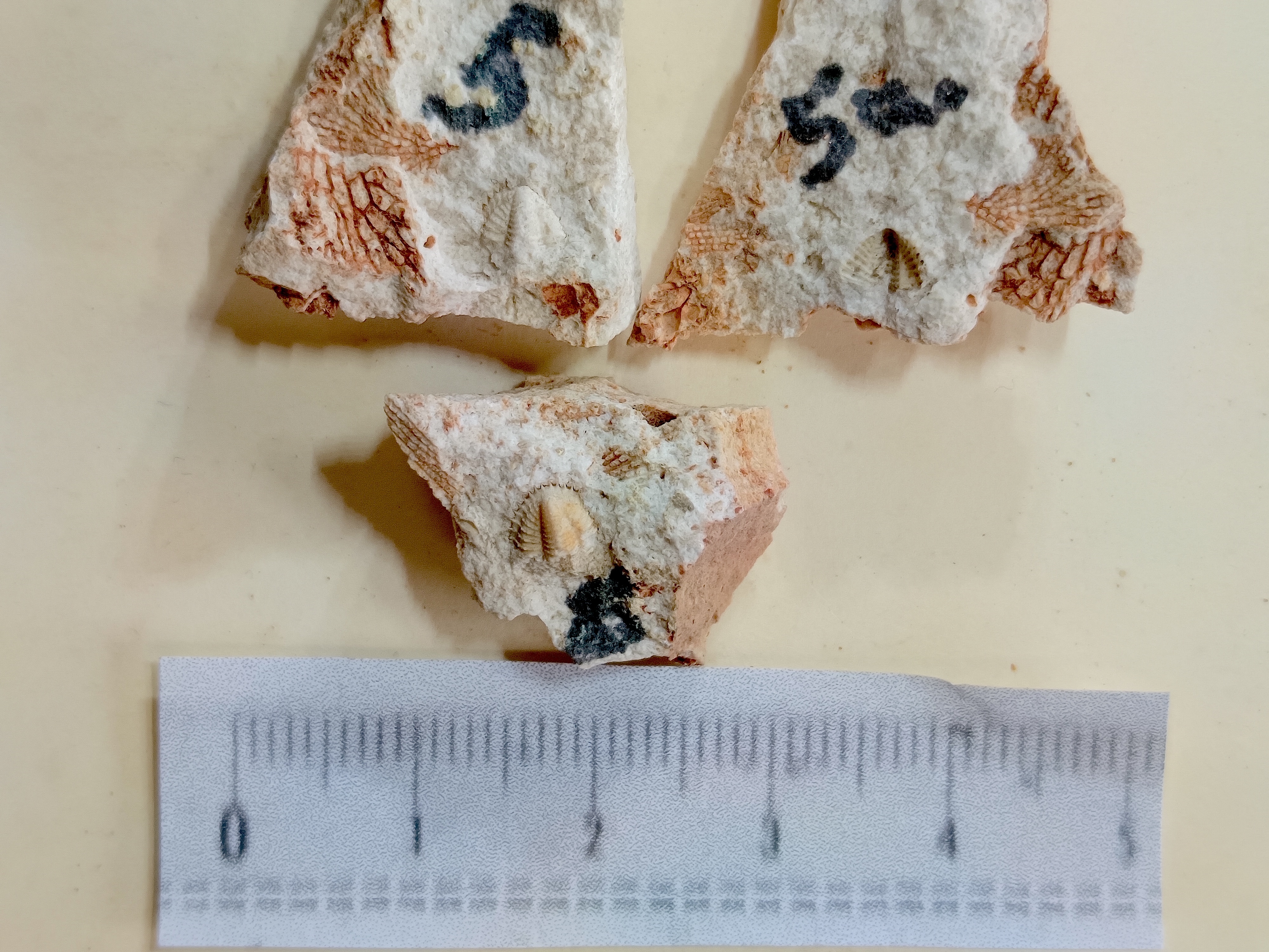 Unidentified fossils: Photo up close. Those without numbers may be parts of crinoids. Number 4 is a mystery.
