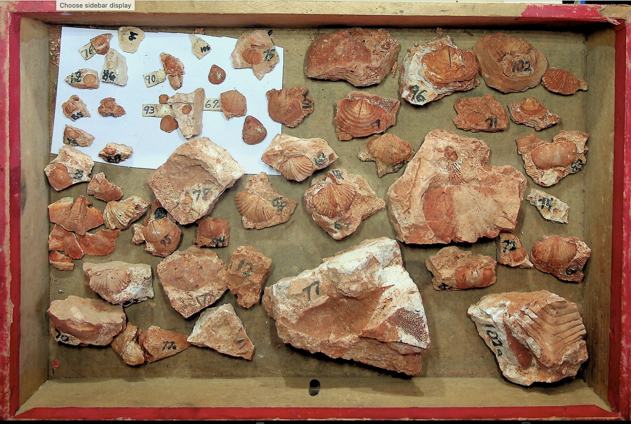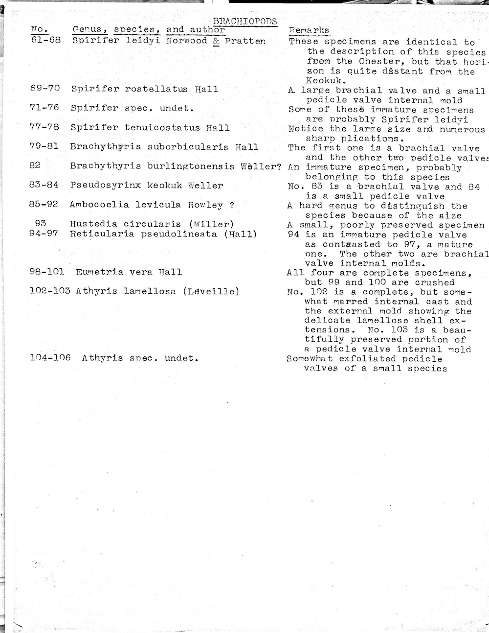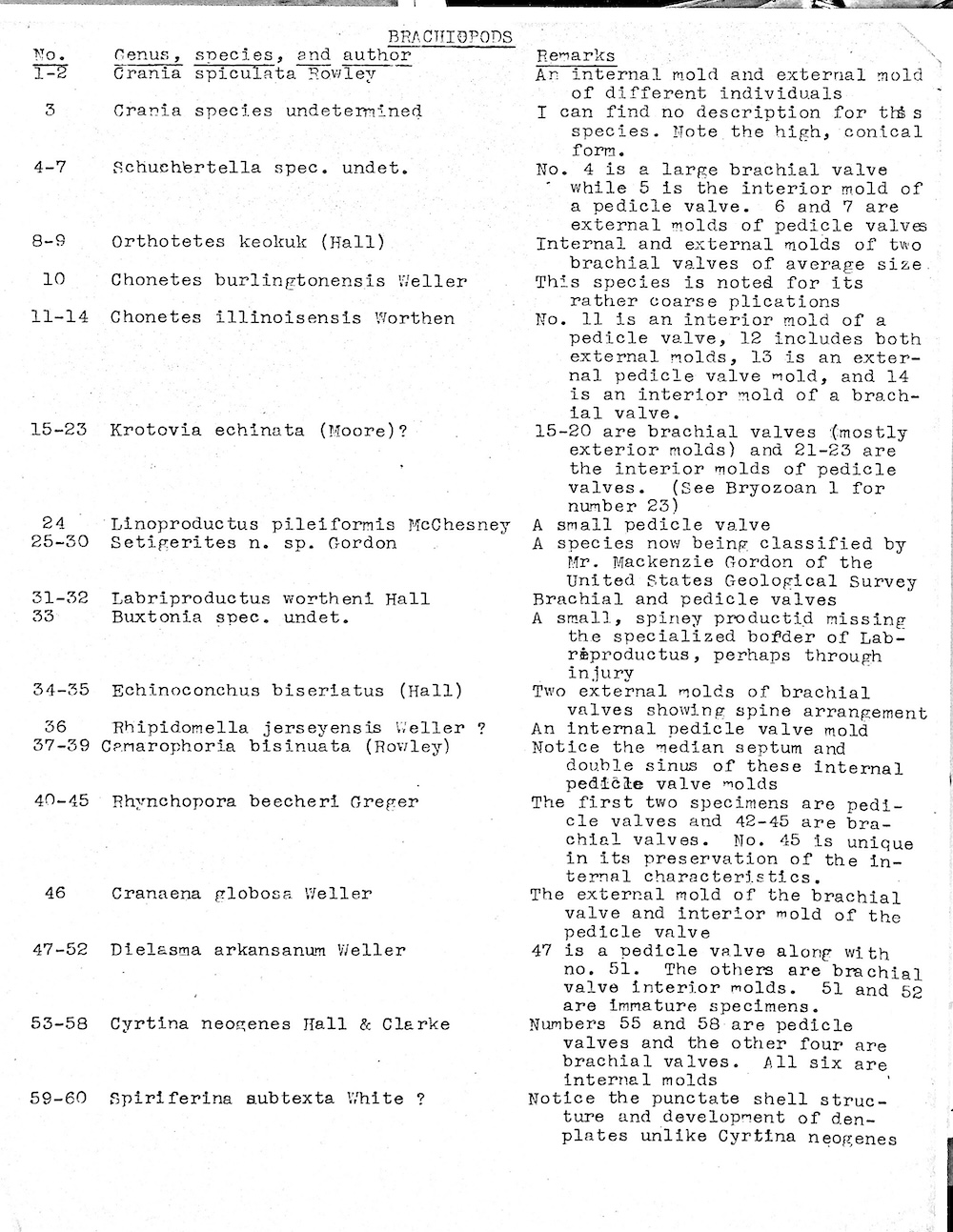 Brachiopods. 23 different genera: Group one photo with identification page and close-up photo; Group two photo with identification page and close-up photo with identification page; Close-up photo of Orthotetes and Athyris; Close-up photo of Spirifer and Reticularia; Close-up of Orthotetes; Close-up photo of Setigerites, new species; Close-up photo of Spirifer; Close-up photo of Linoproductus . The last four include comparison to specimens from other rocks.