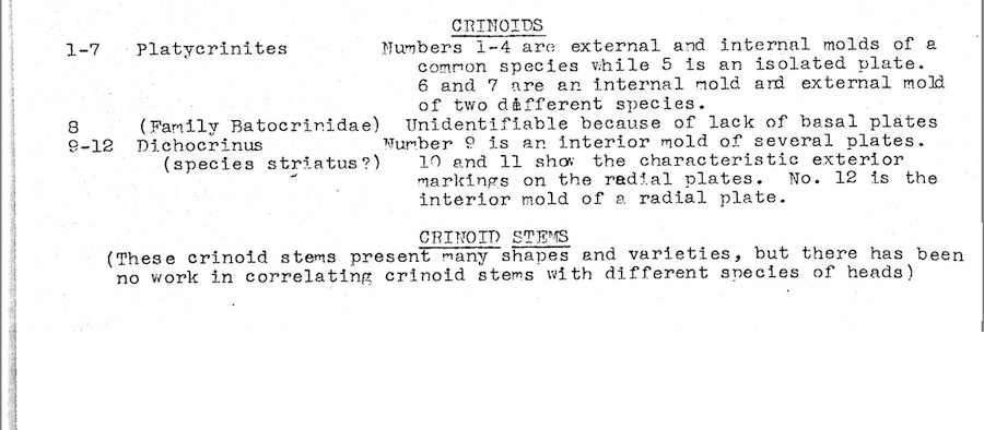 Crinoids. 3 different genera as well as unidentified crinoid stems. General photo with identification page; close-up photo of Platycrinites head: close-up photos of crinoid stem plates and sections of crinoid stems.