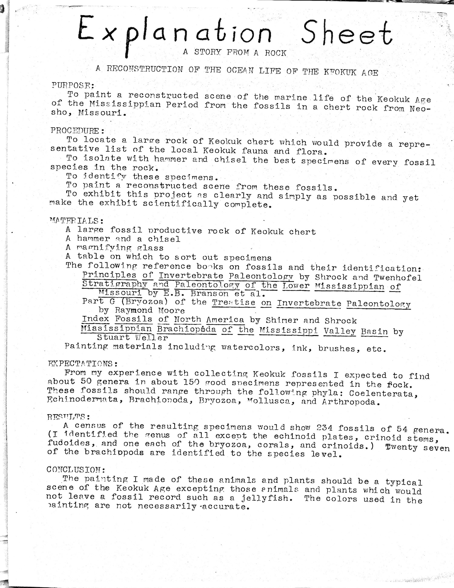 The Story from a Rock was a science fair presentation that I created at the age of 17. For several years I had collected fossils from a hillside behind our house, and for this project I chose a rather large rock almost a meter in width to find all the fossils that were buried together at more or less the same geological time. See the explanation sheet.