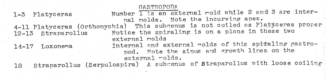 Gastropods. 3 different genera: General photo with identification page and 4 close-up photos: Platyceras; Platyceras orthonychia; Straparollus and Loxonema; Straparollus serpulospira.