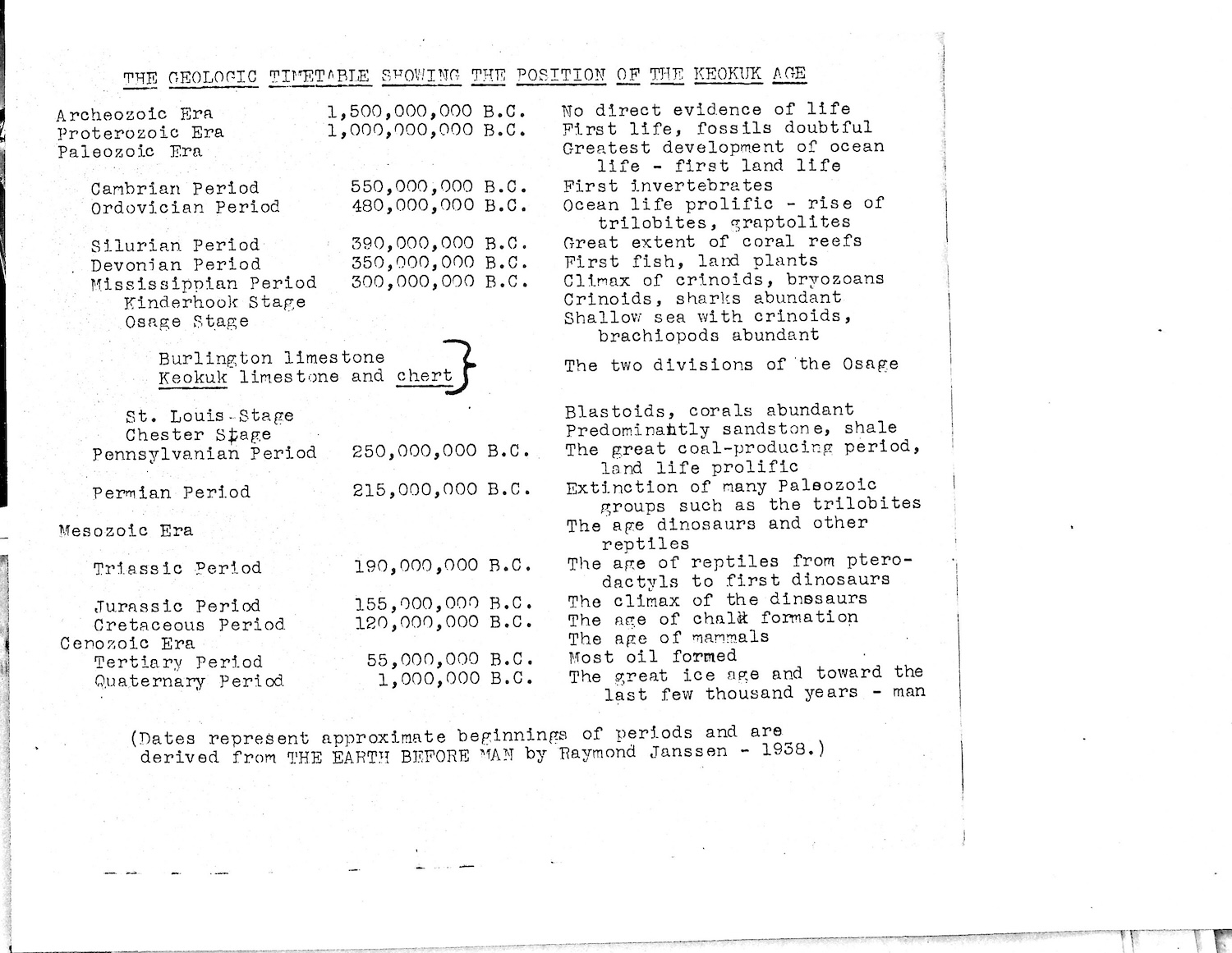 The geological formation in which this rock with its fossils was formed was the Keokuk chert of the Mississippian Period, about 270 million years ago.