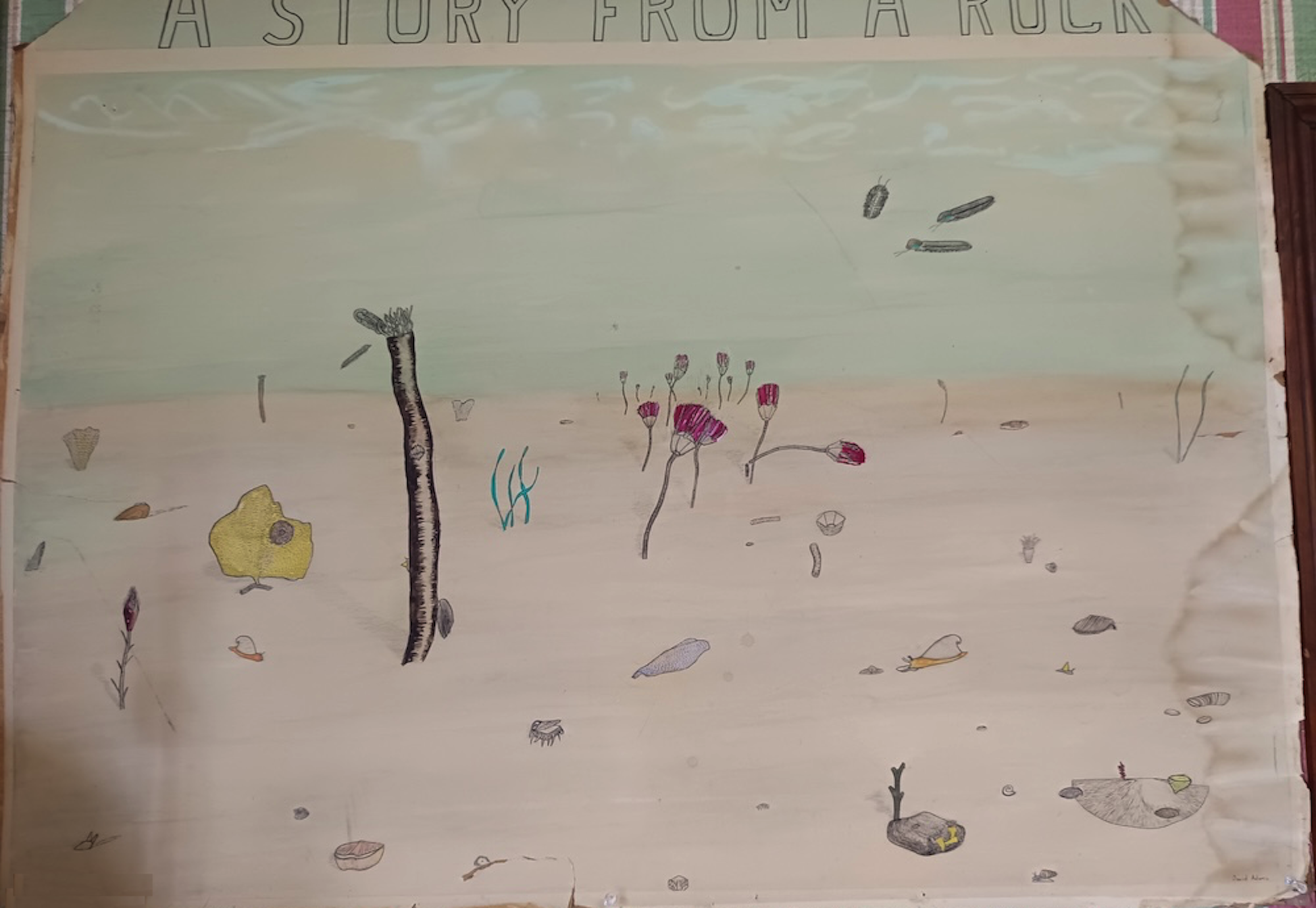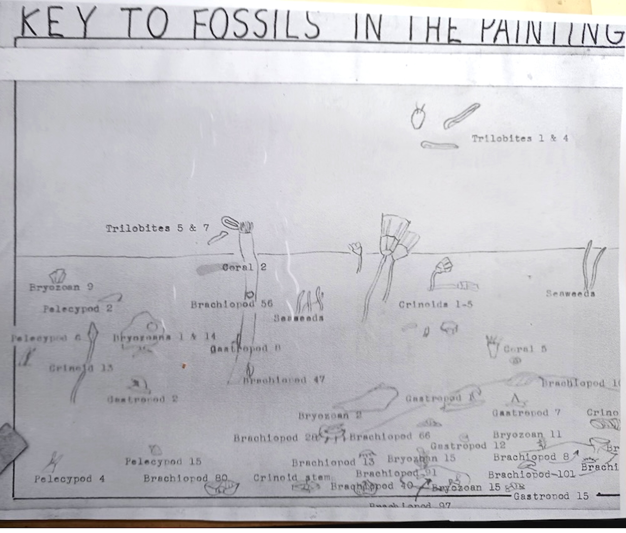 With the help of my art teacher and friend of the family, Maude-Mary Wilson, I painted an imaginary reconstruction of the shallow sea with its animals based on the fossils, along with an identification key.