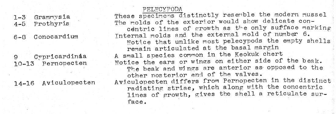 Pelecypods: 6 different genera: General photo with identification page and close-up photos of Aviculopecten, Conocardium and Cypricardinia.