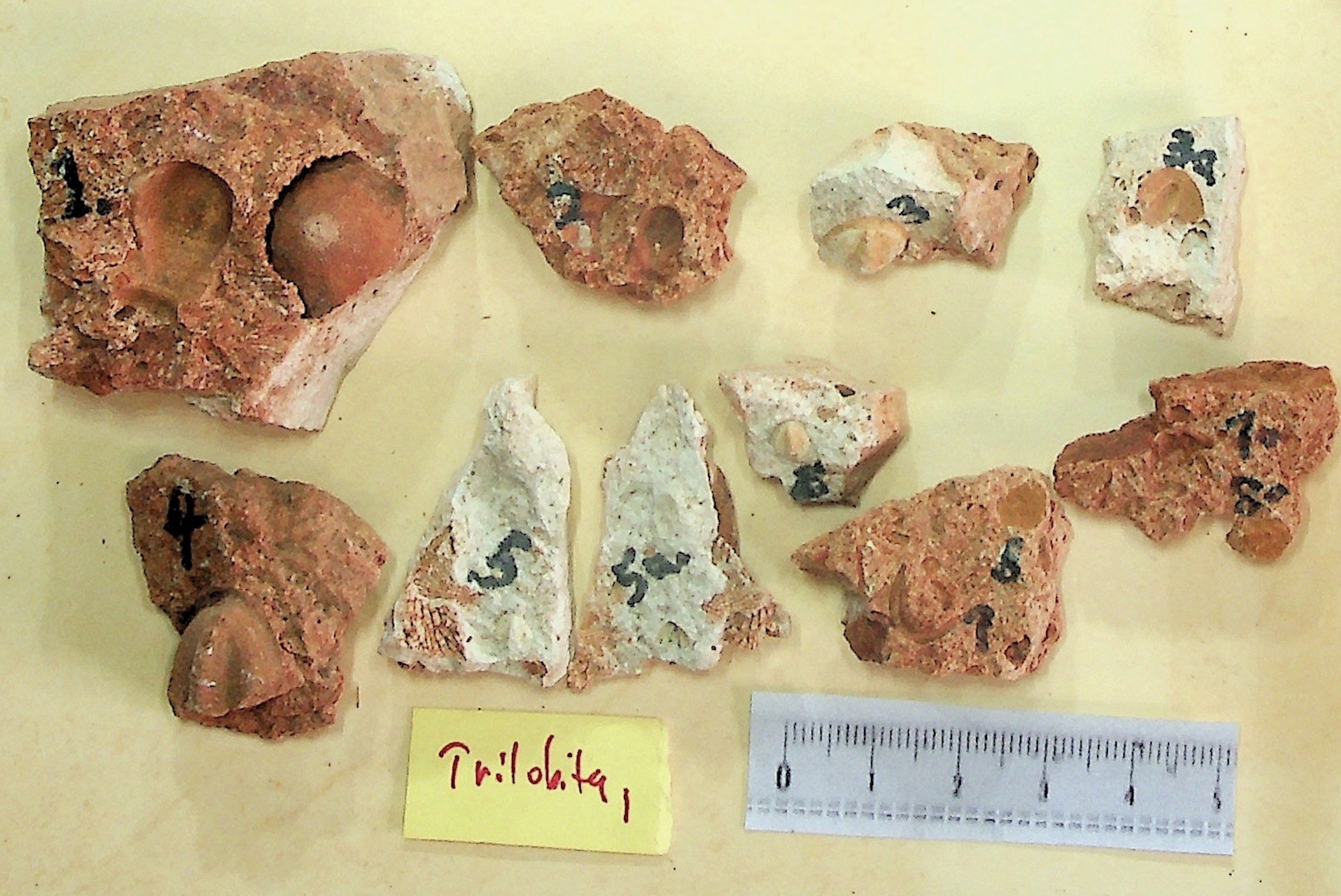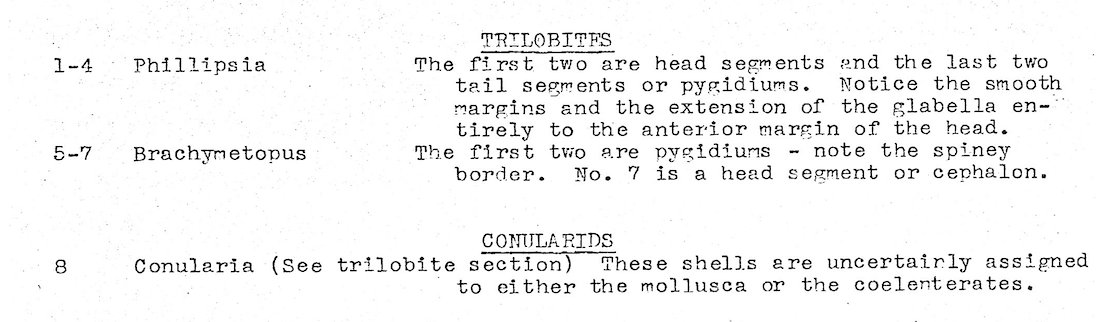 Trilobites and Conularids: 2 different general of trilobites and an unidentified Conularid: General photo with identification page and close-up photos of Brachymetarus trilobite and unidentified Conularid.