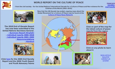 As described here earlier the International Year for a Culture of Peace, the UN General Assembly in 1998 proclaimed the Decade 2001-2010 as the International Decade for a Culture of Peace and Non-Violence for the Children of the world, and in 2000 they put UNESCO in charge of the Decade. However, by 2004 it had become evident that the new administration of UNESCO would do almost nothing to make the Decade a success. Federico Mayor agreed to provide me with some funds from his Fundación Cultura de Paz to coordinate a report about civil society initiatives for the Decade to be submitted to the UN General Assembly at for the Decade midterm in 2005.
