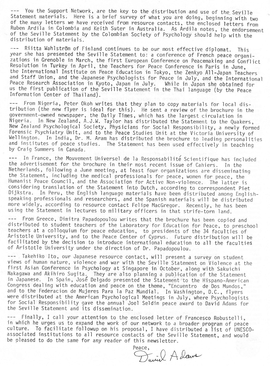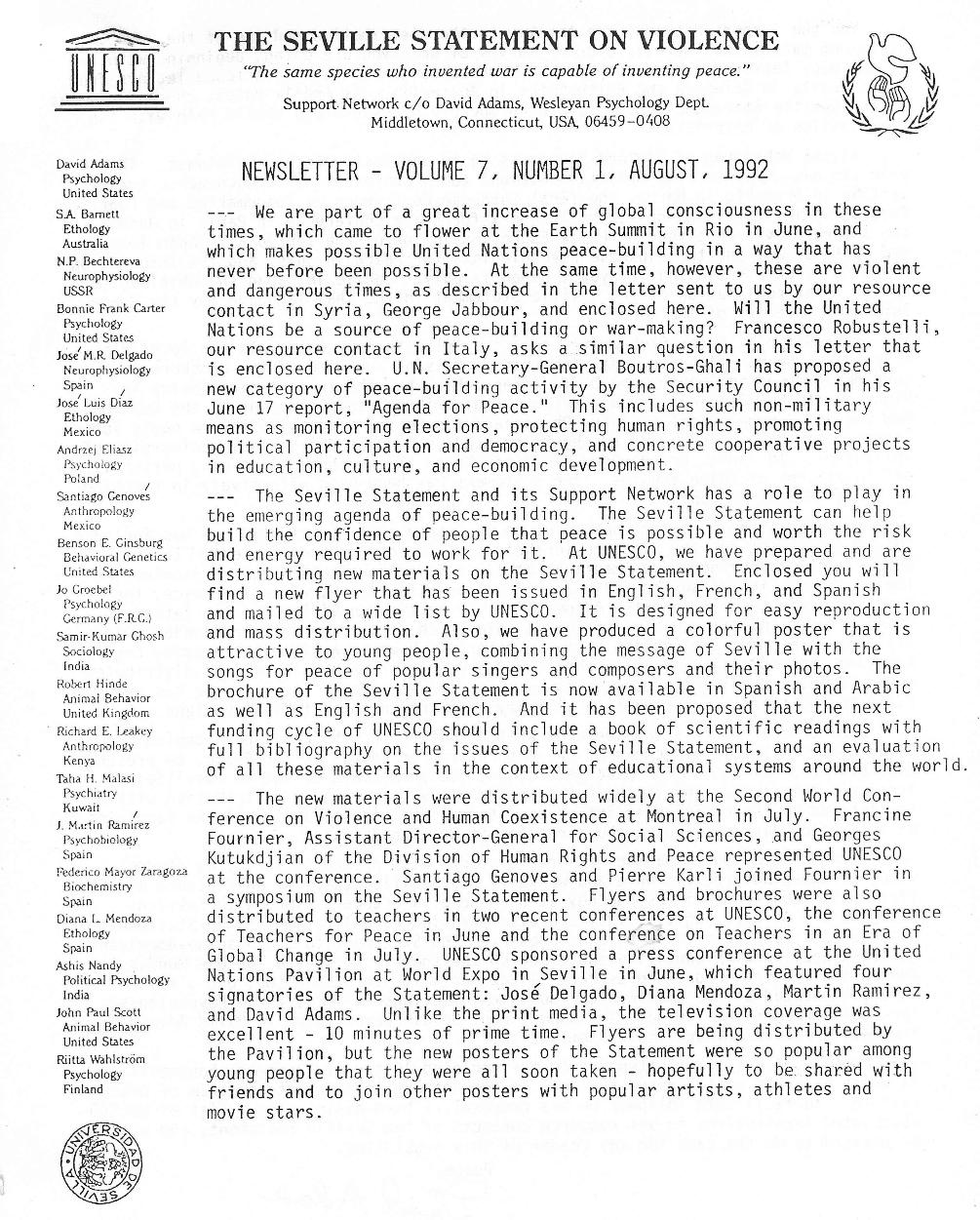 The Seville Statement Newsletter, Volume 7, Number 1