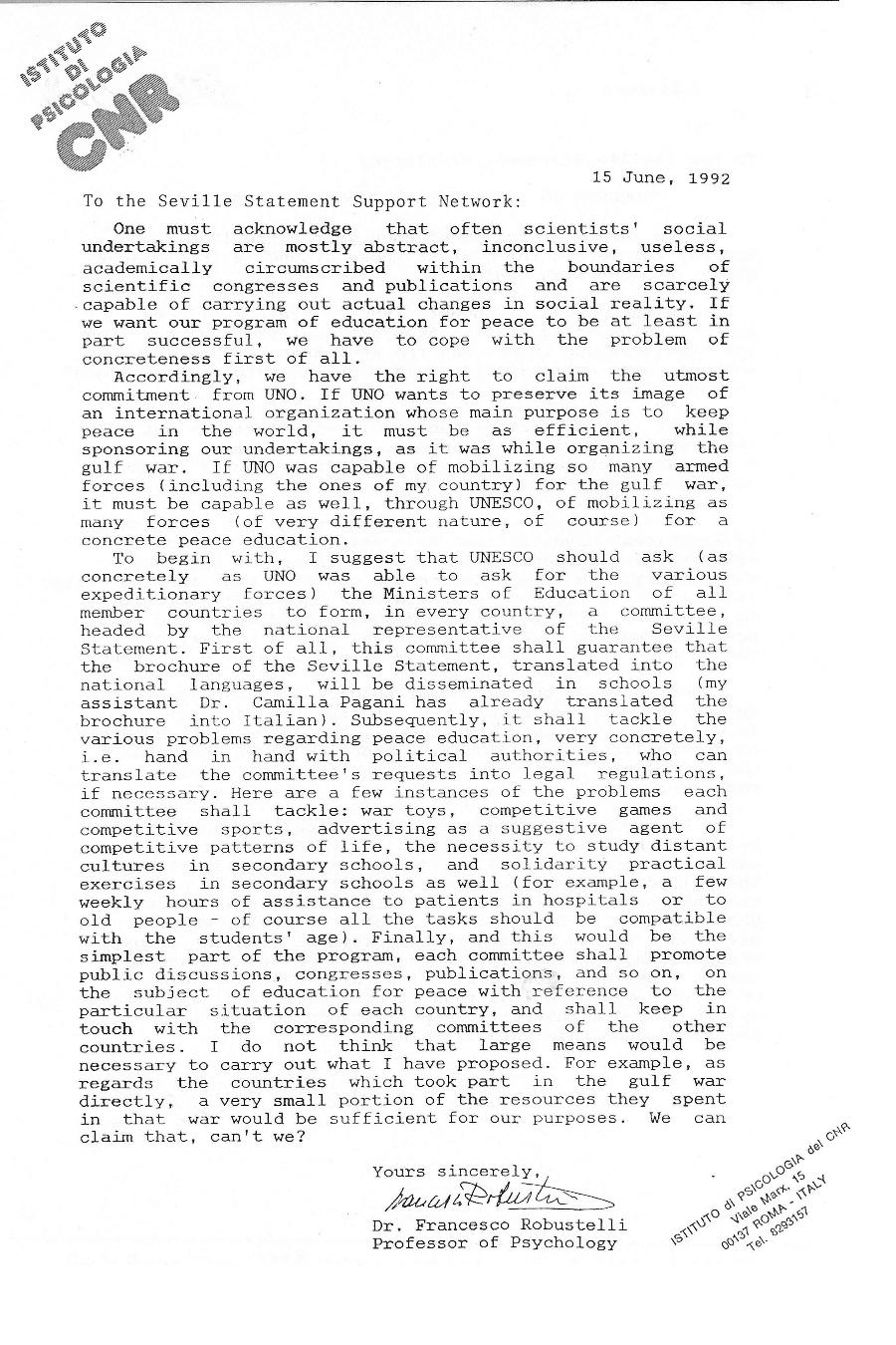 Letter from Professor Francesco Robustelli
