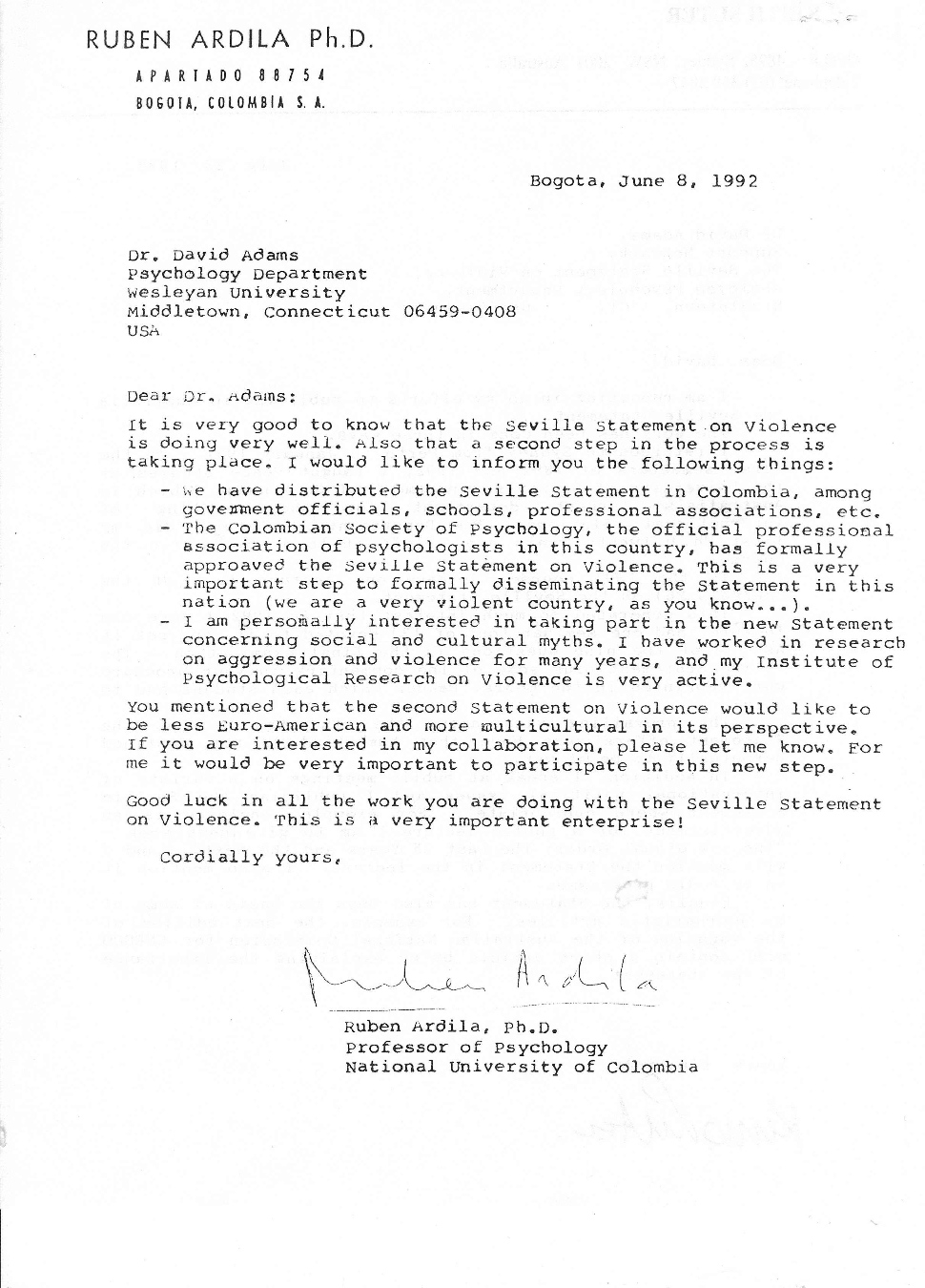 Letter from Professor Ruben Ardila